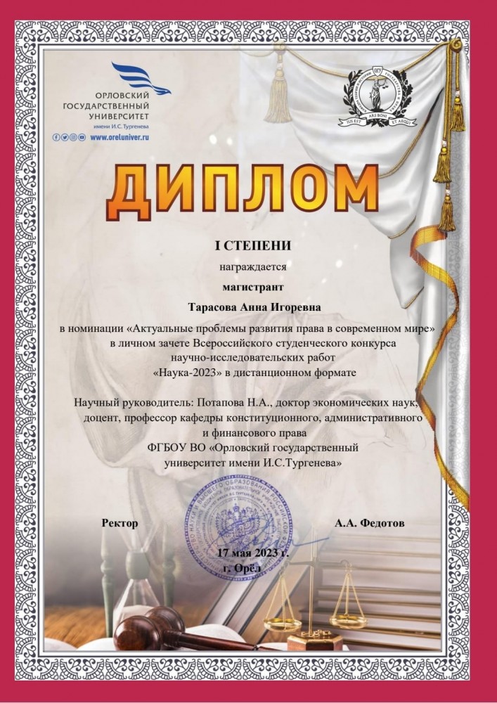 В целях повышения качества и эффективности юридического образования и создания условий, способствующих развитию интеллектуального и творческого потенциала школьников и студентов, вовлечения их в научно-исследовательскую деятельность, содействия повышению их квалификации был проведен Всероссийский студенческий конкурс научно-исследовательских работ «Наука-2023». После подведения итогов, студентка магистратуры 40.04.01 «Юриспруденция» Тарасова Анна Игоревна награждена Дипломом I степени в номинации «Актуальные проблемы развития права в современном мире», научный руководитель д.э.н., профессор кафедры конституционного, административного и финансового права Потапова Н.А.