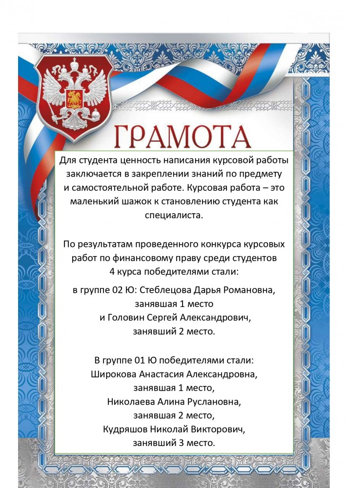 29 февраля 2024 г. конкурс курсовых работ по Финансовому праву для студентов 4 курса юридического института