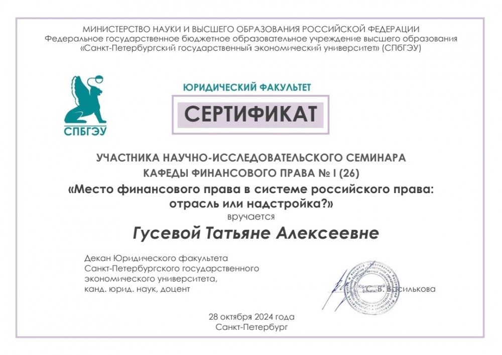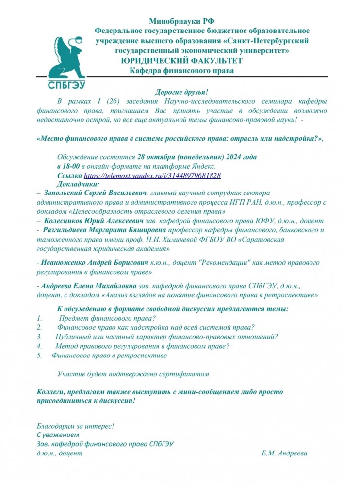 28.10.2024 в онлайн-формате круглого стола состоялась дискуссия с коллегами о месте финансового права в системе российского права. Встреча состоялась по инициативе зав. кафедрой финансового права Юридического факультета ФГБОУ ВО СПБГЭУ д.ю.н. Е.М. Андреевой
