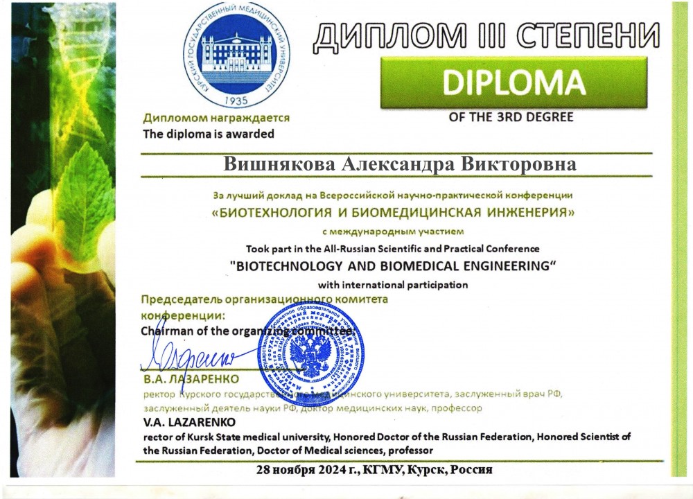 Студенты и аспиранты кафедры приняли участие в XIV Всероссийской научно-практической конференции «Биотехнология и биомедицинская инженерия» с международным участием, посвященной 89-летию Курского государственного медицинского университета. Докладчики выступали в рамках СИМПОЗИУМА 13. «ПОЛУЧЕНИЕ, ИССЛЕДОВАНИЕ И МЕХАНИЗМ ДЕЙСТВИЯ БИОЛОГИЧЕСКИ АКТИВНЫХ ВЕЩЕСТВ», который территориально проводился в ОГУ им. И.С. Тургенева под руководством зав. кафедрой д.т.н. Кузнецовой Е.А., модератор - доцент кафедры Шаяпова Л.В. Было представлено 6 докладов и один доклад представил студент магистратуры из Башкирского государственного аграрного университета Галямов Д.З. В рамках конференции стали победителями Симпозиума и удостоились Дипломов за лучший доклад, представленный на конференции следующие молодые ученые: Бушуева К.А - магистрант 1 курса ( за доклад, в котором представлены результаты научных исследований, проведенных в рамках Гранта РНФ №24-26-00259), студентка 3 курса направления подготовки 19.03.01 Биотехнология Мельникова Д.Д., магистрант 1 курса Вишнякова А.В. и аспирант кафедры Перевозчиков П.