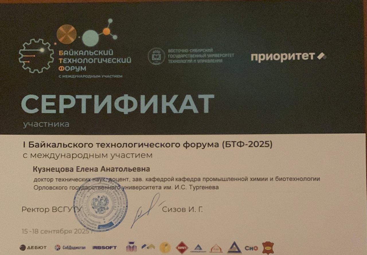 С 15 по 18 сентября в Восточно-Сибирском государственном университете технологий и управления (г. Улан-Удэ) прошел Первый Байкальский технологический форум с международным участием, в котором приняла участие зав. кафедрой д.т.н. Кузнецова Елена Анатольевна. Форум стал площадкой для встречи ведущих ученых, экспертов и промышленников из России и стран Азии. Среди международных гостей присутствовали представители Казахстана, Кыргызстана, Узбекистана и Монголии, которые представили перспективные разработки в различных технологических сферах. В рамках форума работала площадка "Пищевые и биотехнологии", на которой проходила VII Международная научно-практическая конференция "Биотехнология в интересах экологии и экономики территорий". Во время конференции д.т.н. Кузнецова Елена Анатольевна выступила с докладом на тему "Биокаталитические технологии в обеспечении качества и безопасности зерновых хлебобулочных изделий" (исследование выполнено в рамках проекта РНФ №24-26-00259). Участники конференции проявили большой интерес к научным исследованиям кафедры.