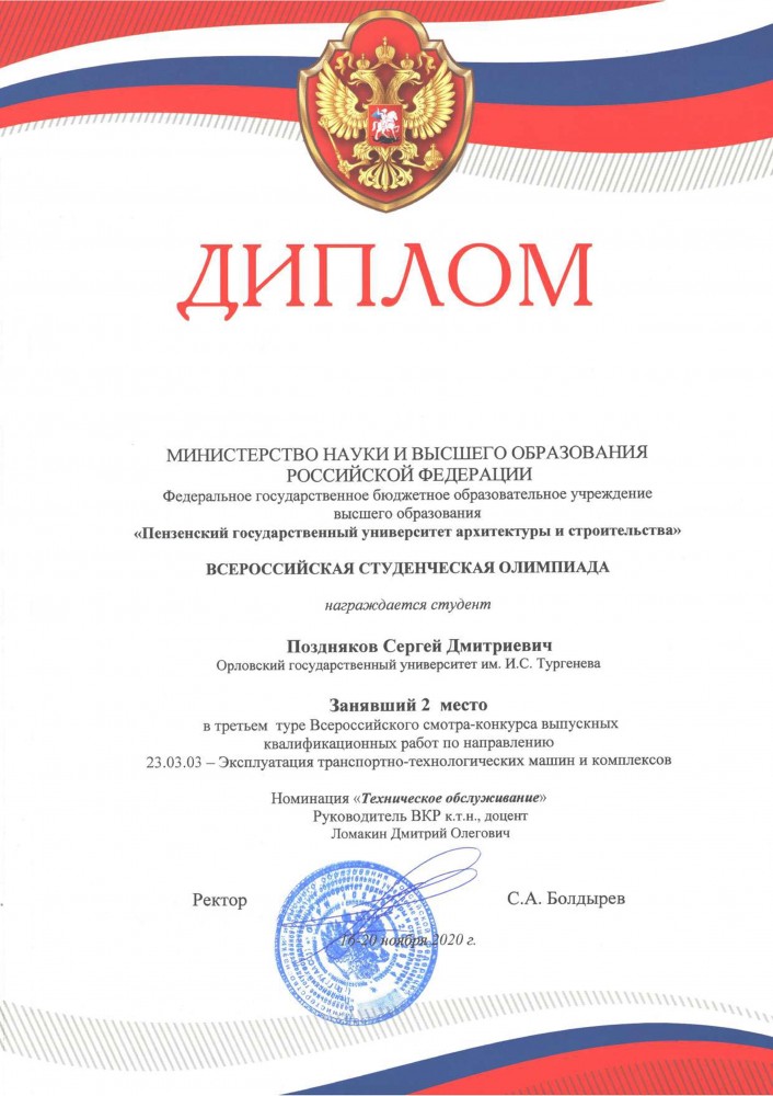 Поздравляем наших выпускников Позднякова Сергея Дмитриевича и Теплова Александра Олеговича, занявших призовые места в третьем туре Всероссийского смотра-конкурса выпускных квалификационных работ по направлению 23.03.03 – Эксплуатация транспортно-технологических машин и комплексов, который прошел в Пензенском государственном университете архитектуры и строительства 16-20 ноября 2020 года.