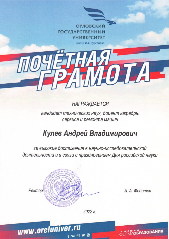 Доцент кафедры сервиса и ремонта машин Кулев Андрей Владимирович отмечен грамотой университета за высокие достижения в научно-исследовательской деятельности.