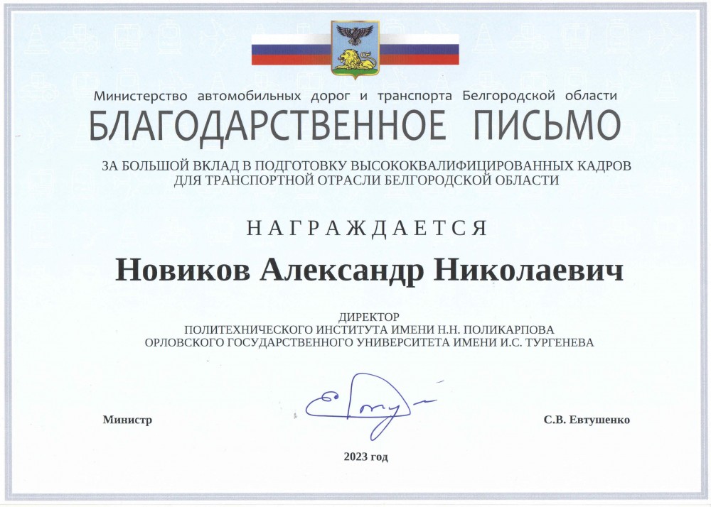 Благодарственным письмом Министерства автомобильных дорог и транспорта Белгородской области награжден д.т.н., профессор, директор Политехнического института имени Н.Н. Поликарпова Новиков Александр Николаевич за большой вклад в подготовку высококвалифицированных кадров для транспортной отрасли Белгородской области.