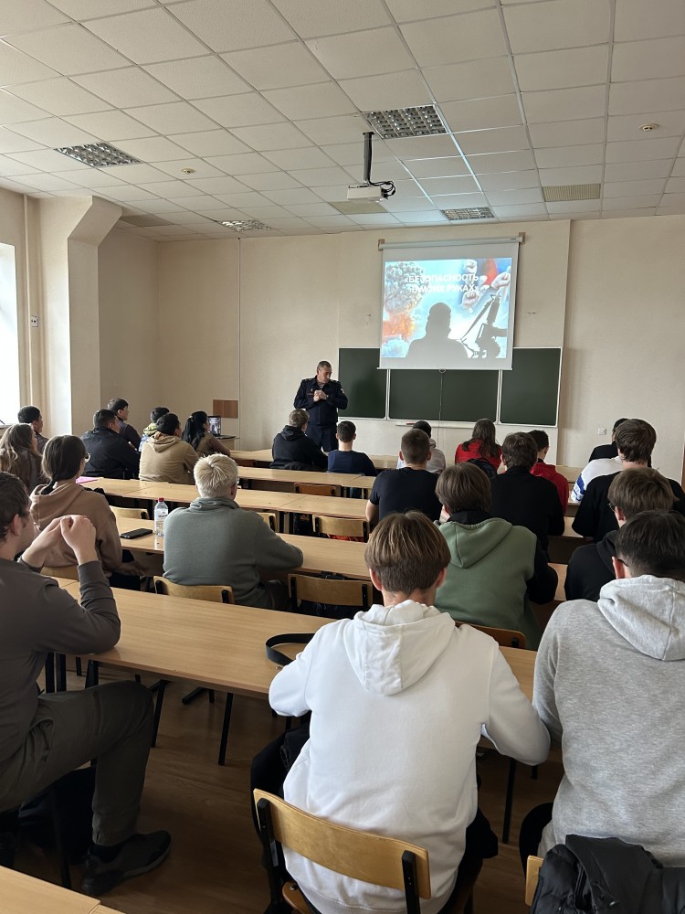 Студенты кафедры сервиса и ремонта машин 24.10.2024 г. приняли участие во встрече с майором полиции, помощником начальника Управления Федеральной службы войск национальной гвардии Российской Федерации по Орловской области Захаровым Сергеем Владимировичем. Встреча была организована Координационным центром ОГУ им. И.С. Тургенева. Цели мероприятия: предупреждение вовлечения молодежи в проведение несогласованных публичных мероприятий; разъяснение норм законодательства об административной и уголовной ответственности за противоправные действия, в том числе экстремистской направленности.