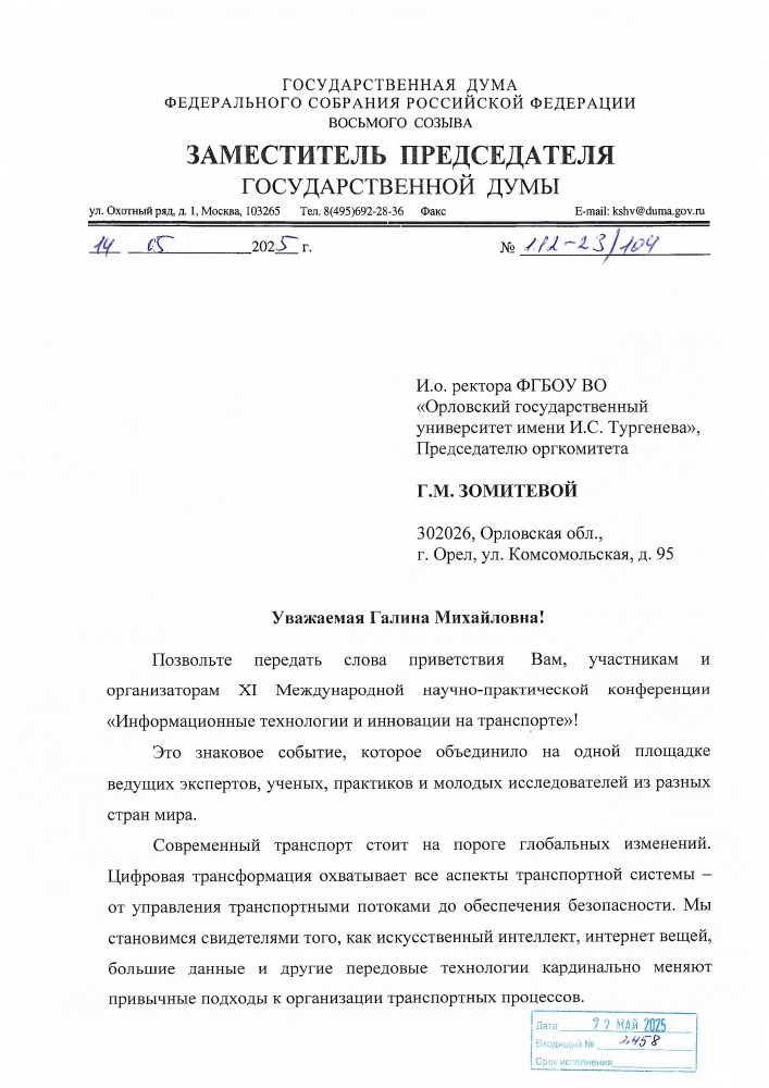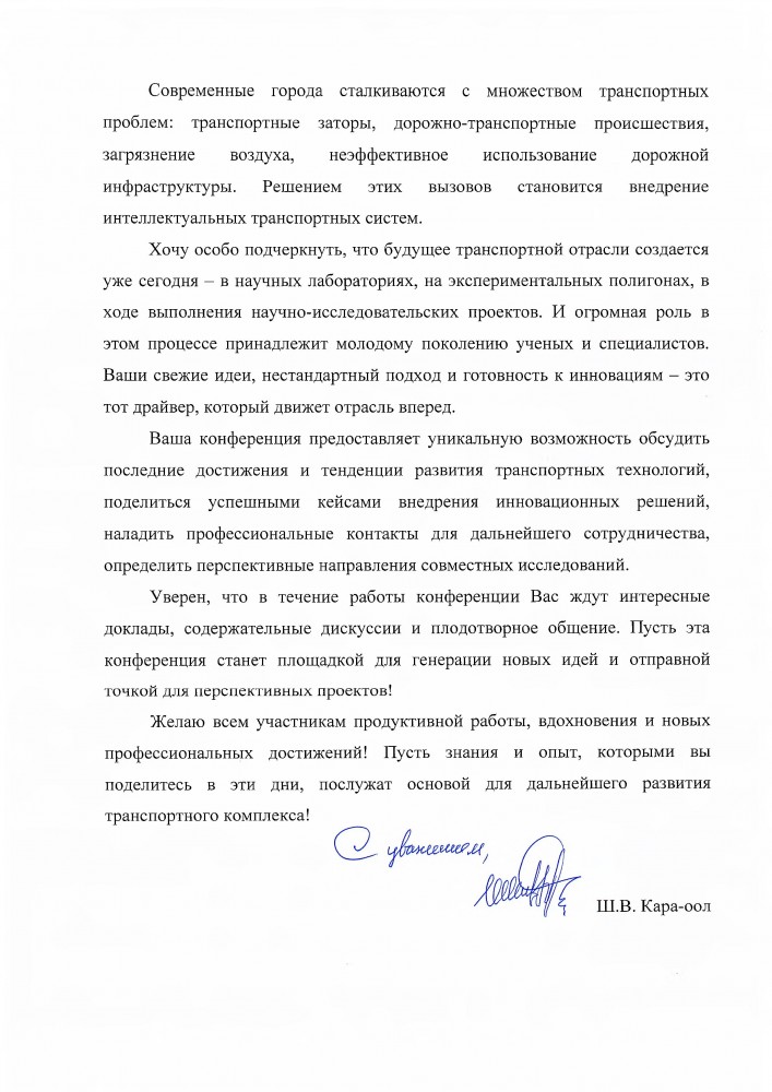 Заместитель председателя Государственной Думы Кара-оол Шолбан Валерьевич передал свои слова приветствия участникам и организаторам XI Международной научно-практической конференции «Информационные технологии и инновации на транспорте».