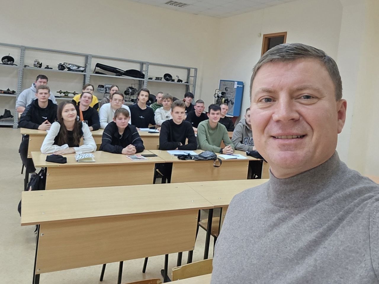 11 октября 2025 года доктор технических наук, профессор кафедры сервиса и ремонта машин, депутат Государственной Думы Еремин Сергей Васильевич провел лекции для студентов групп 41НТС, 51НТС, 53НТС и 41ТТ по дисциплинам «Основы законодательства в сфере дорожного движения», «Введение в профессиональную деятельность» и «Технология и организация процессов перевозки».