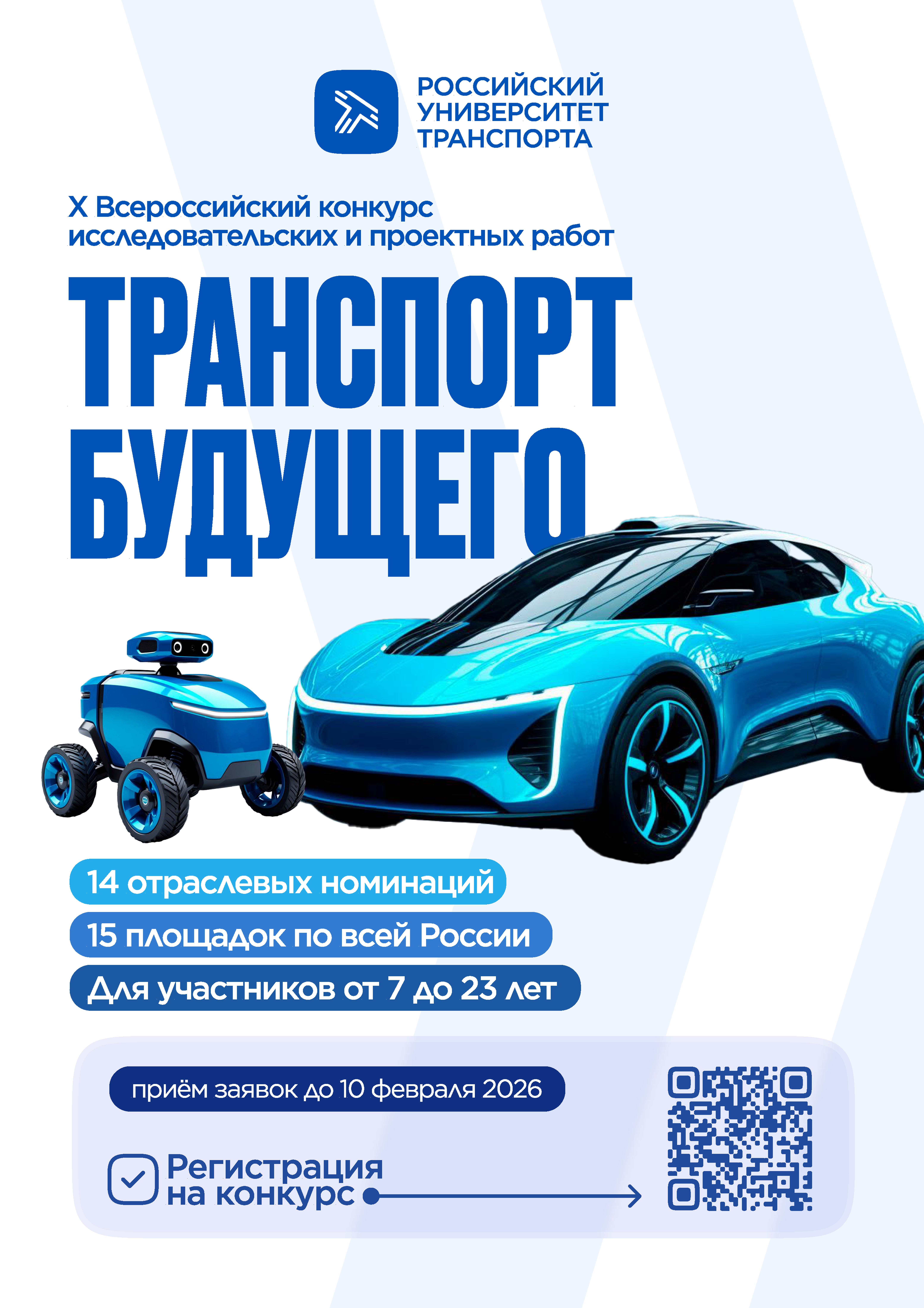 Открыт приём заявок на «Транспорт будущего» — Всероссийский конкурс исследовательских и проектных работ. Участвовать могут школьники и студенты колледжей и вузов в возрасте до 23 лет включительно. Подать заявку можно до 10 февраля 2026 г. на сайте конкурса.