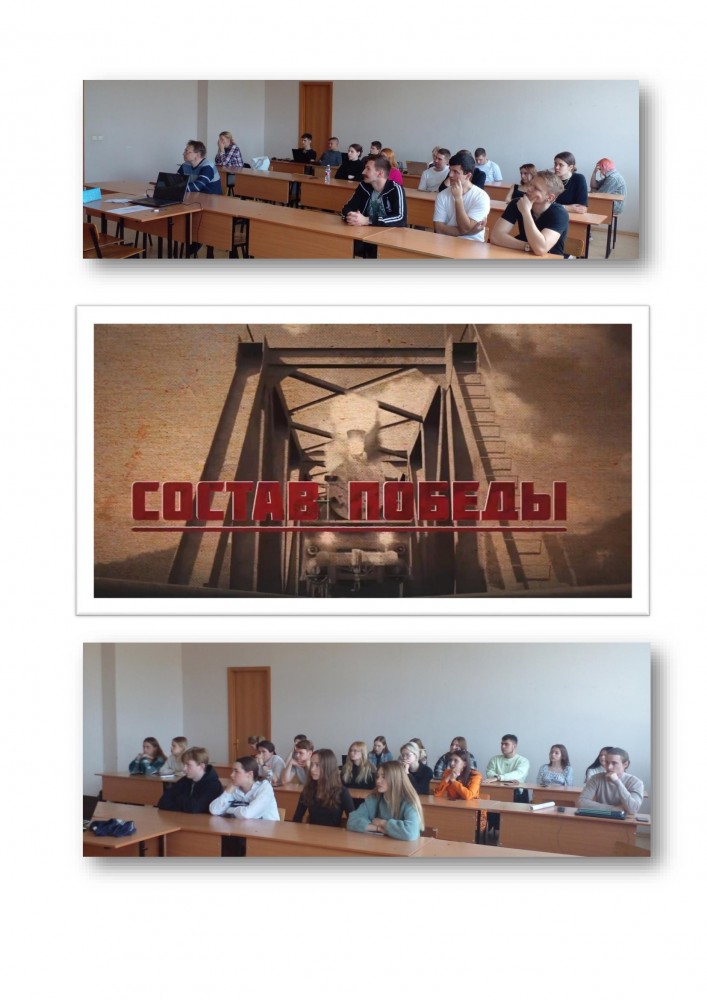 В рамках акции с обучающимися 1, 2 и 3 курсов направления подготовки Градостроительство прошел показ документального фильма «Без срока давности», а также состоялся просмотр ряда фильмов из цикла «Состав Победы», повествующих о героизме сотрудников-железнодорожников и уникальных масштабных проектах в годы ВОВ «Секретный тоннель», «Эвакуация музейных сокровищ. Как спасали сокровища Третьяковской галереи и Эрмитажа».