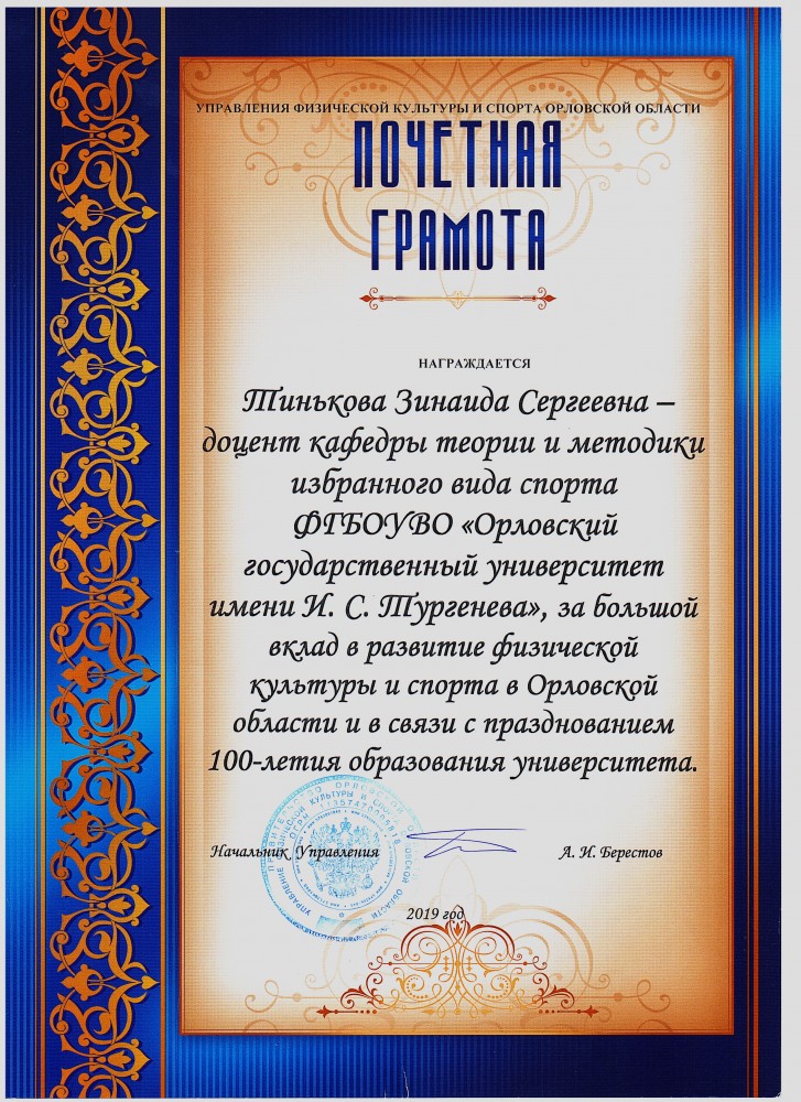 Грамоты от Управления физической культуры и спорта Орловской области за большой вклад в развитие физической культуры и спорта получили зав.кафедрой к.п.н., доцент Соломченко Марина Александровна, к.п.н., доцент кафедры Тинькова Зинаида Сергеевна и к.п.н., доцент кафедры Бойко Валерий Вячеславович.
