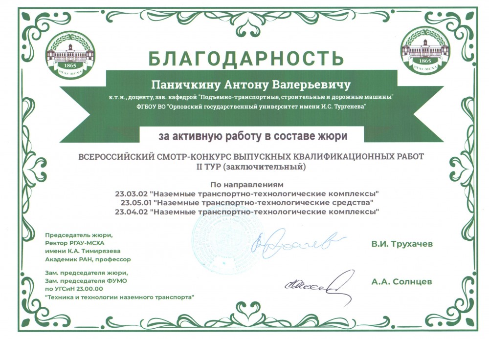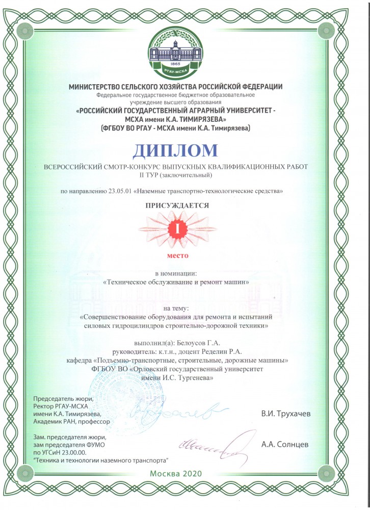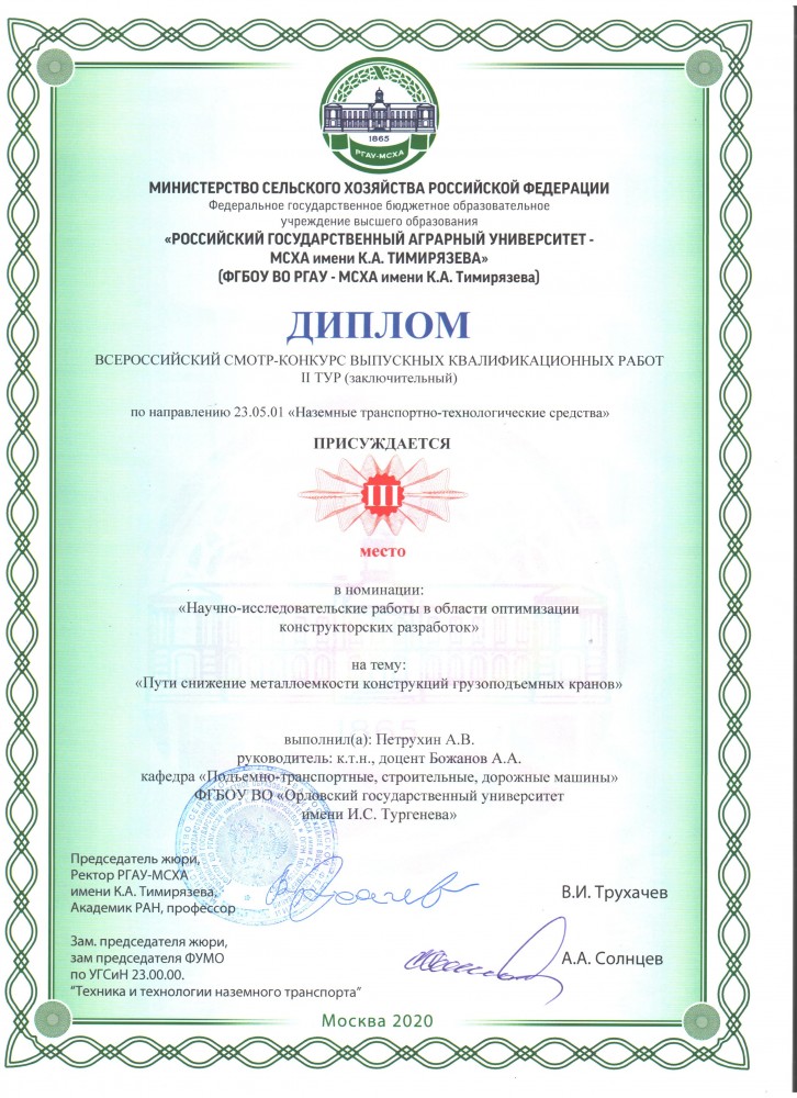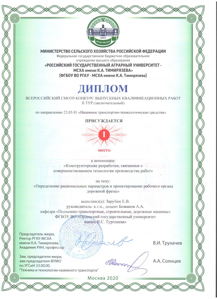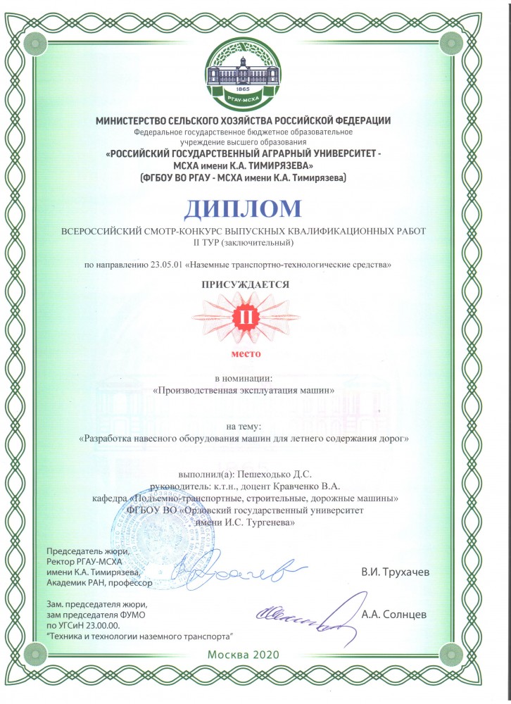 Поздравляем выпускников кафедры и руководителей выпускных квалификационных работ с получением призовых мест во Всероссийском смотре конкурсе выпускных квалификационных работ, проходившем на базе ФГБОУ ВО РГАУ-МСХА имени К.А. Тимирязева г. Москва.