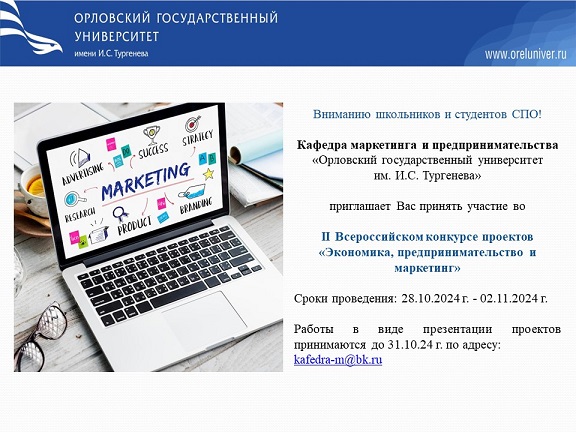 С 27 октября по 1 ноября 2025 г. на базе института экономики и управления ФГБОУ ВО «Орловский государственный университет имени И.С. Тургенева» будет проходить III Всероссийский конкурс проектов «Экономика, предпринимательство и маркетинг»