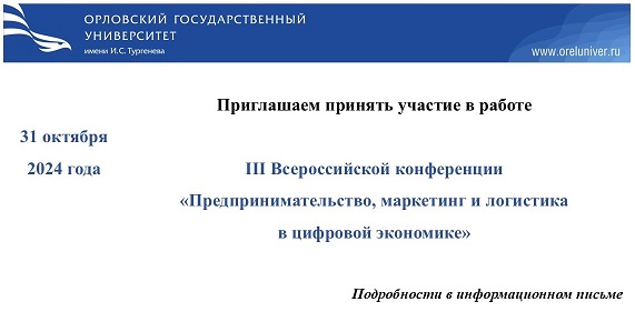 31 октября 2025 года на базе ФГБОУ ВО «Орловский государственный университет имени И.С. Тургенева» пройдет IV Всероссийская конференция «Предпринимательство, маркетинг и логистика в цифровой экономике». Приглашаем к участию.