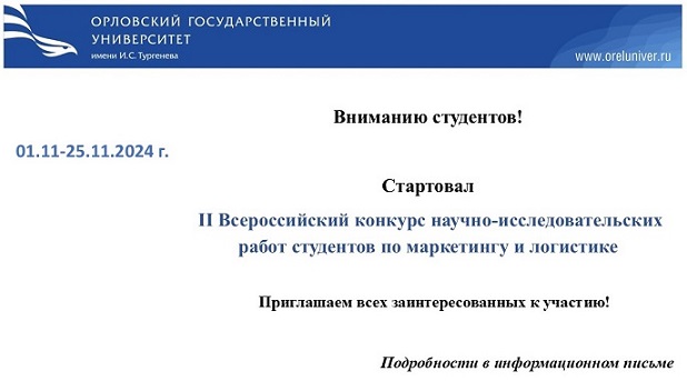 На базе института экономики и управления ФГБОУ ВО «Орловский государственный университет имени И.С. Тургенева» будет проходить III Всероссийский конкурс научно-исследовательских работ студентов по маркетингу и логистике.