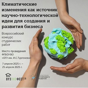 С 7 апреля по 25 апреля 2025 г. на базе института экономики и управления ФГБОУ ВО «Орловский государственный университет имени И.С. Тургенева» будет проходить Всероссийский конкурс студенческих работ «Климатические изменения как источник научно-технологической идеи для создания и развития бизнеса»