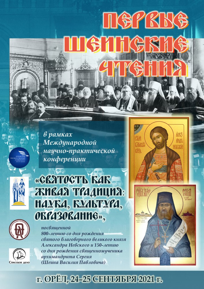 Кафедра теологии, религиоведения и культурных аспектов национальной безопасности ОГУ имени И.С. Тургенева приглашает 24-25 сентября 2021 г. принять участие в работе I Шеинских чтений, проводимых в рамках Международной научно-практической конференции «Святость как живая традиция: культура, наука, образование», посвященной 800-летию со дня рождения св. блгв. великого князя Александра Невского и 150-летию со дня рождения сщмч. архим. Сергия (Василия Павловича Шеина), уроженца Новосильского района Орловской области.