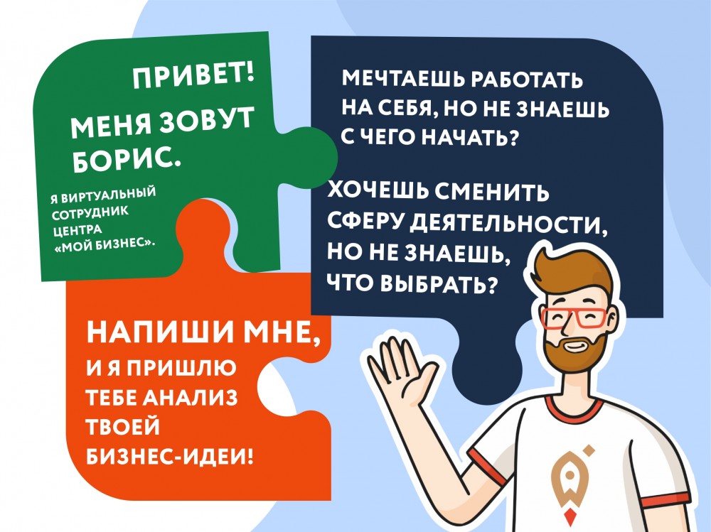 Проект «Привет, Борис! Чем заняться?» представляет собой форму обращения к виртуальному сотруднику Центра «Мой бизнес», который предложит заполнить краткую форму на сайте и затем пришлет на почту готовый анализ бизнес-идеи.