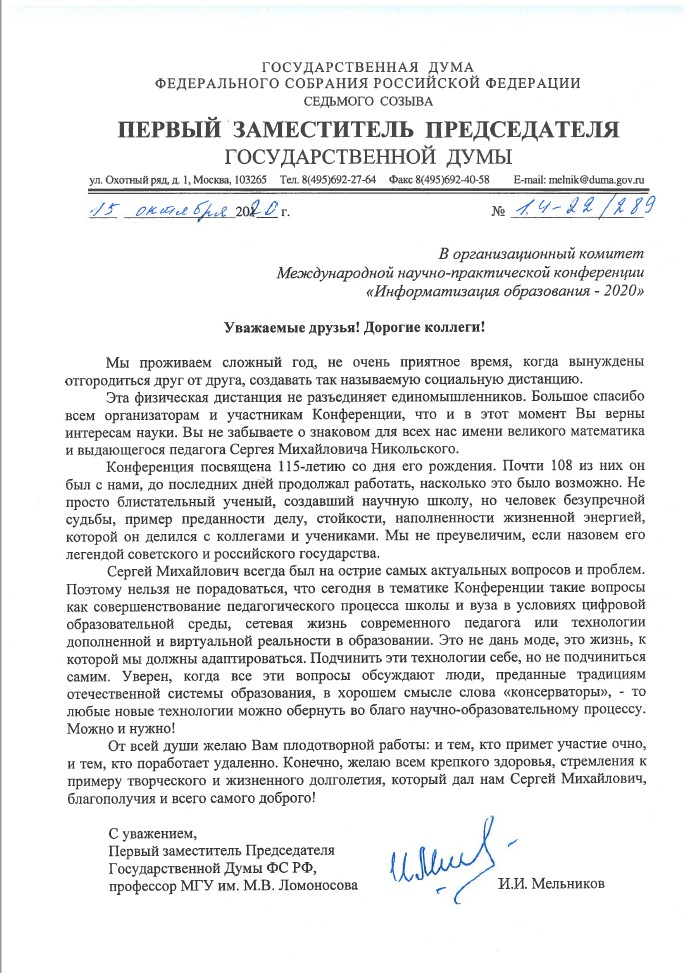 Она зачитала для присутствующих обращение от первого заместителя председателя Государственной думы Федерального собрания РФ Ивана Ивановича Мельникова: