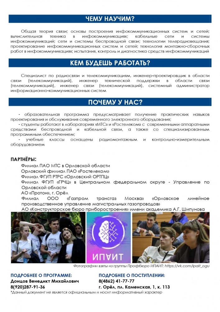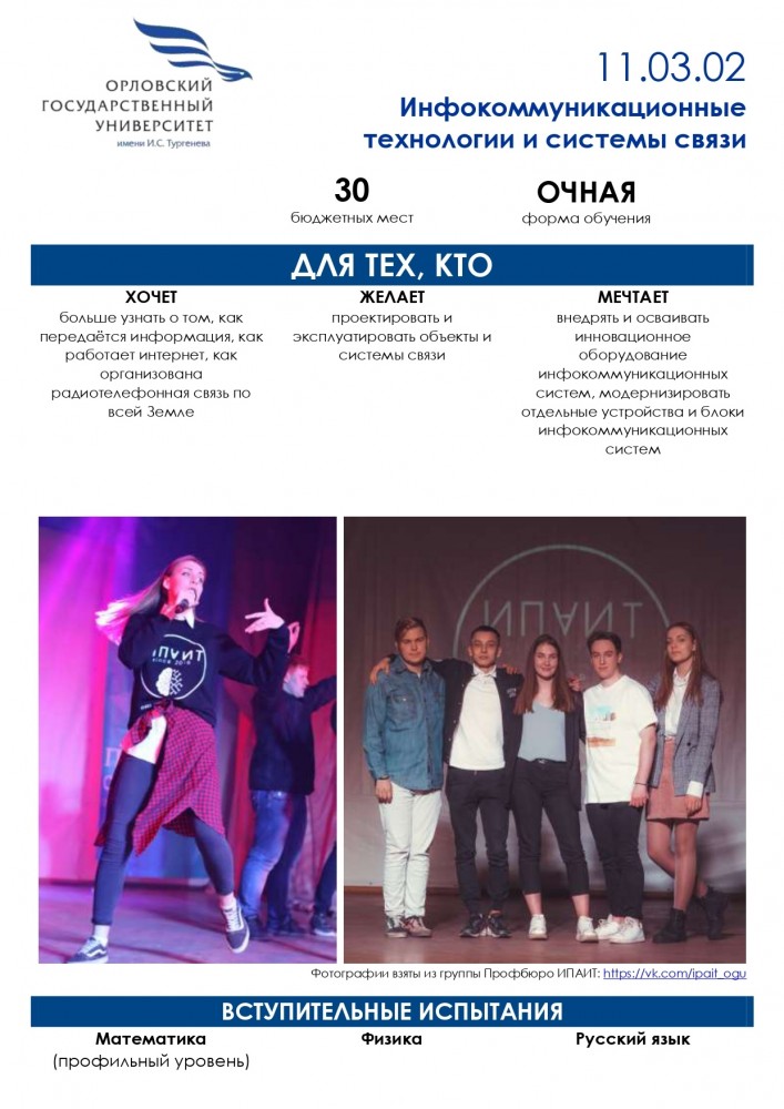 В 2020г набор осуществляется на направления подготовки 11.03.02 (бакалавриат) «Инфокоммуникационные технологии и системы связи», 11.03.03 (бакалавриат) и 11.04.03 (магистратура) «Конструирование и технология электронных средств»