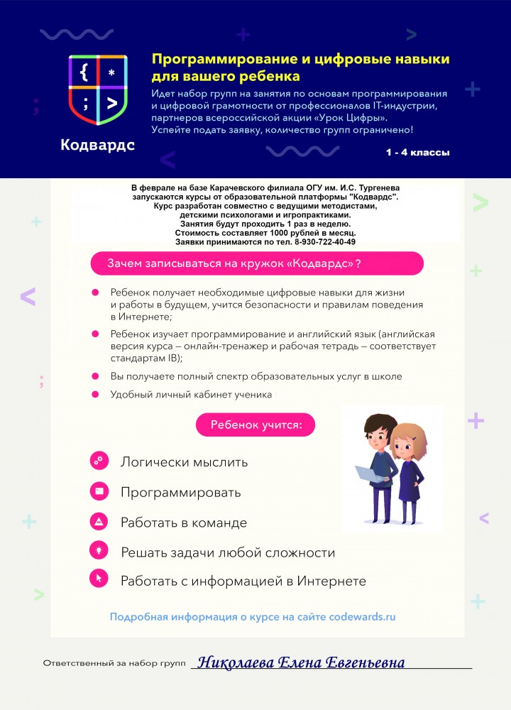 Карачевский филиал ОГУ им. И.С. Тургенева объявляет набор детей, обучающихся в 1-4 классах на курсы по основам программирования и цифровой грамотности с использованием образовательной платформы "Кодвардс".