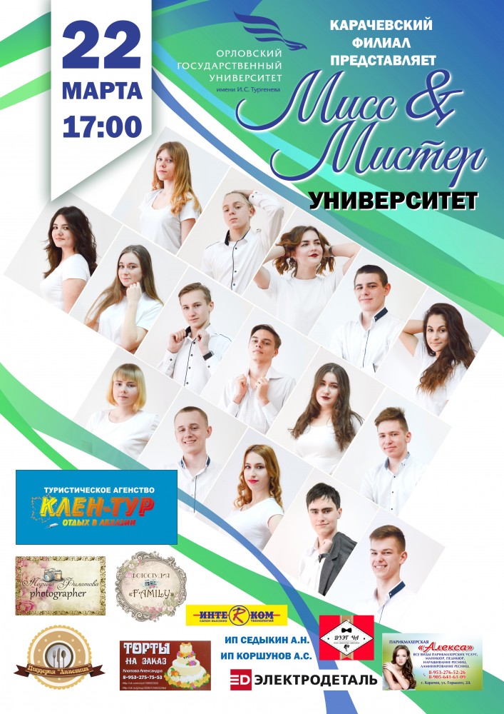 "Мисс и Мистер университет" - самое ожидаемое событие этой весны, привлекающее внимание всех студентов Карачевского филиала ОГУ им. И.С. Тургенева! Ежегодно шоу собирает самых выдающихся, талантливых, ярких и уникальных девушек и парней нашего филиала.