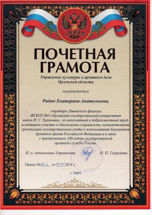 Почетной грамотой Управления культуры и архивного дела Орловской области, за многолетний и добросовестный труд, за активное участие в обеспечении сохранности, комплектовании, организации государственного учета и использования документов награждена секретарь Ливенского филиала ОГУ им. И.С. Тургенева Радюк Е.А.