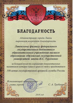 От имени Администрации города Ливны за большой вклад по сохранению документальных памятников истории нашего края, объявлена благодарность директору Ливенского филиала ОГУ им. И.С. Тургенева Бологову Е.Н..
