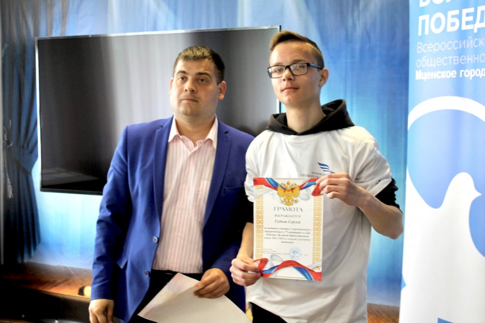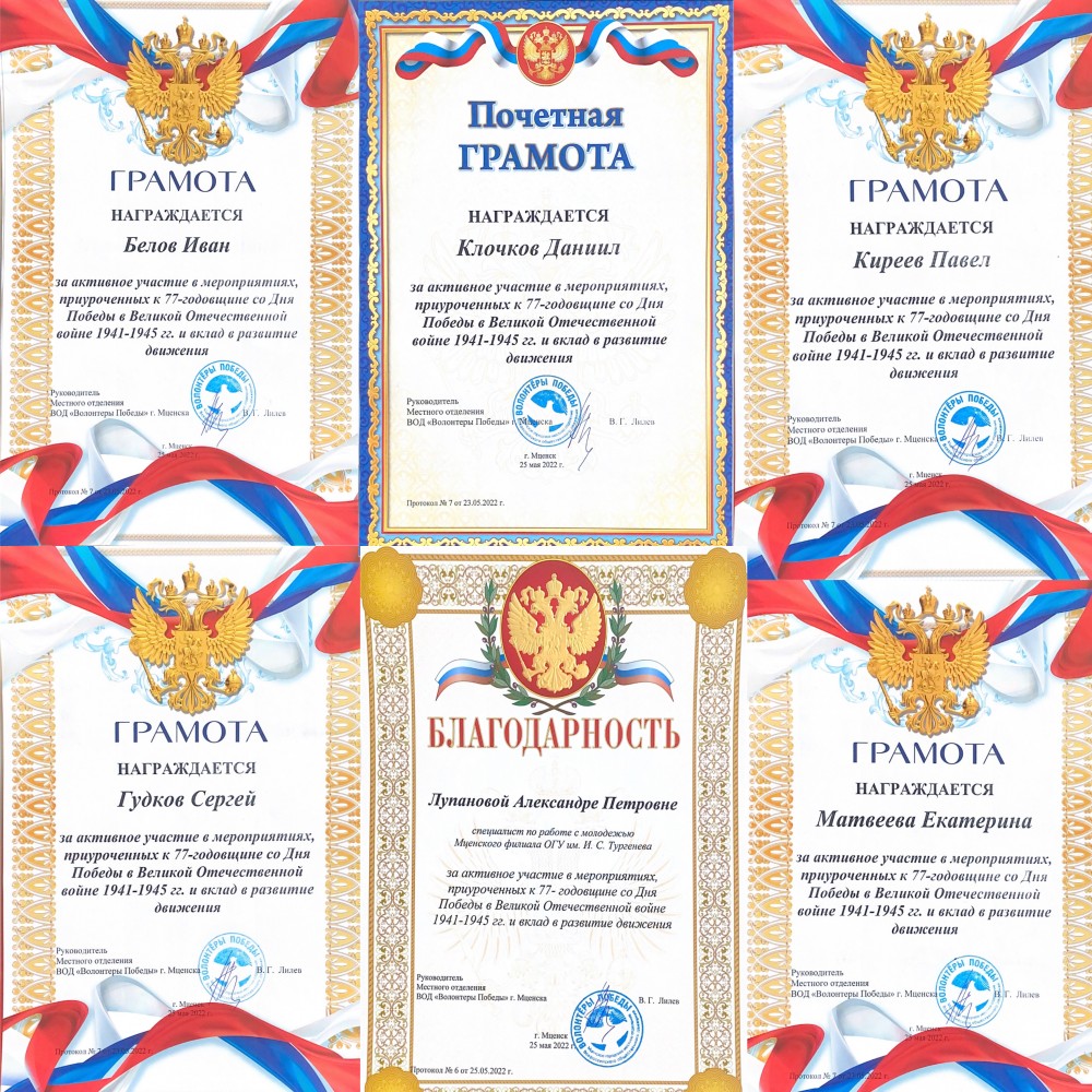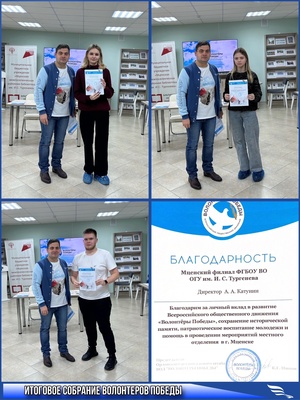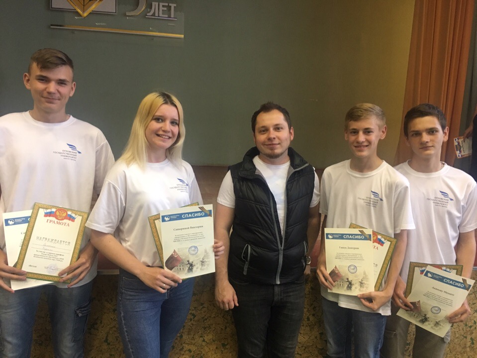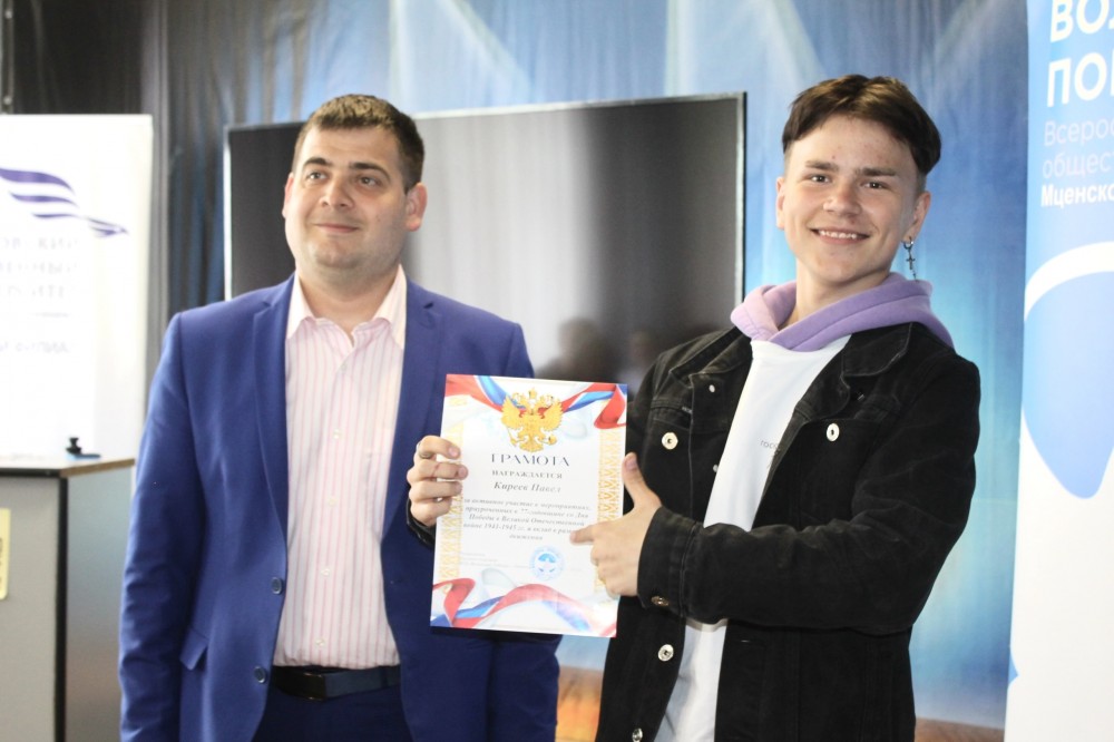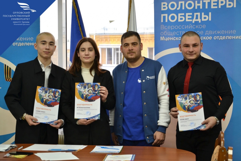 24 мая 2019 года в г. Мценске состоялось собрание активистов Волонтеров Победы, в ряды которых входят обучающиеся Мценского филиала ОГУ имени И.С.Тургенева. На собрании были подведены итоги работы за 2018-2019 учебный год и намечены планы по дальнейшему сотрудничеству волонтерского движения с образовательными организациями г. Мценска. Поздравить ребят и вручить почетные грамоты за активную работу, приехал руководитель регионального отделения ВОД «Волонтеры Победы» Орловской области – Кирилл Ишков. Он поблагодарил волонтеров за активную деятельность и пожелал дальнейших успехов.