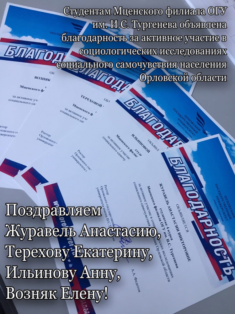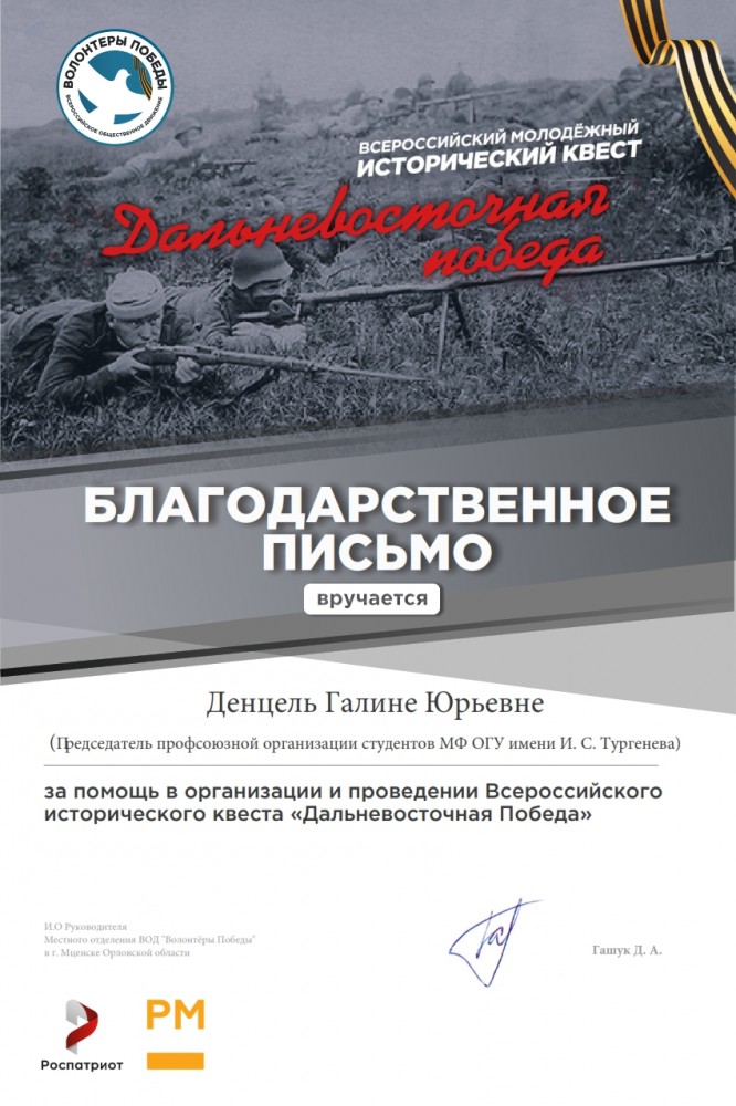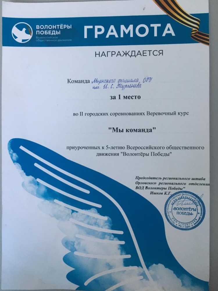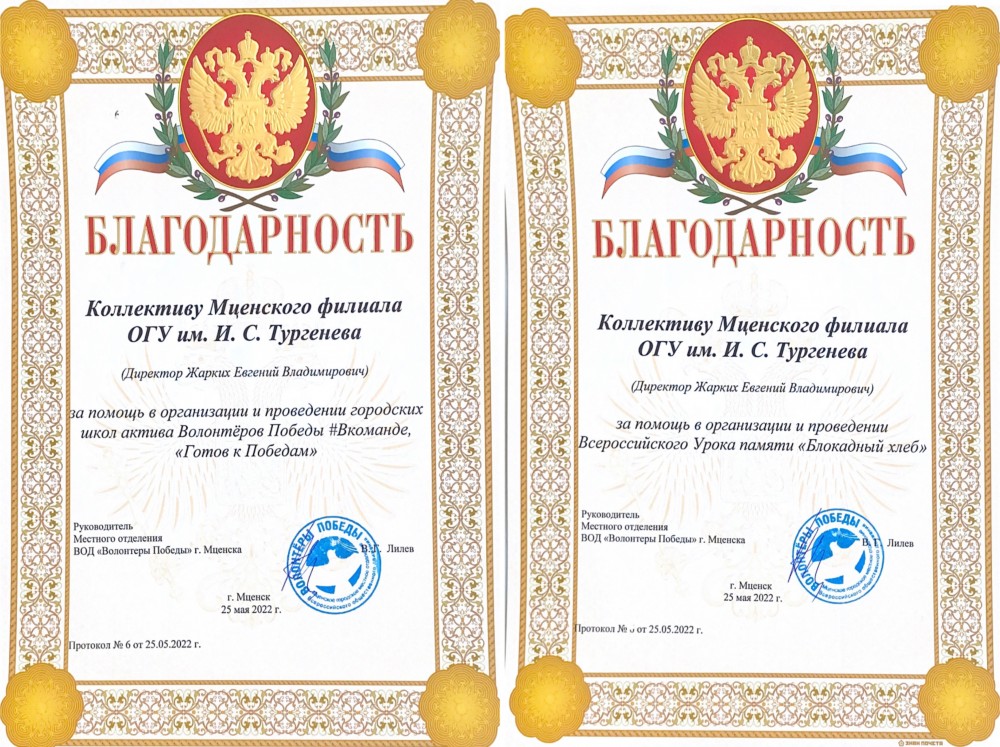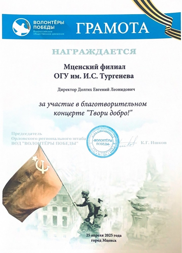 24 мая 2019 года в г. Мценске состоялось собрание активистов Волонтеров Победы, в ряды которых входят обучающиеся Мценского филиала ОГУ имени И.С.Тургенева. На собрании были подведены итоги работы за 2018-2019 учебный год и намечены планы по дальнейшему сотрудничеству волонтерского движения с образовательными организациями г. Мценска. Поздравить ребят и вручить почетные грамоты за активную работу, приехал руководитель регионального отделения ВОД «Волонтеры Победы» Орловской области – Кирилл Ишков. Он поблагодарил волонтеров за активную деятельность и пожелал дальнейших успехов.