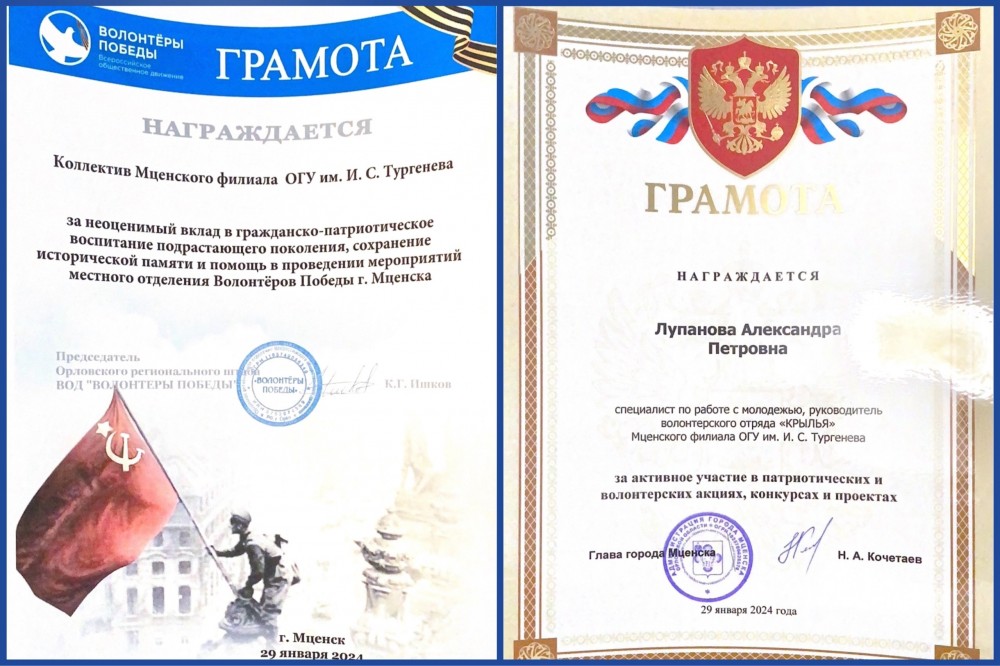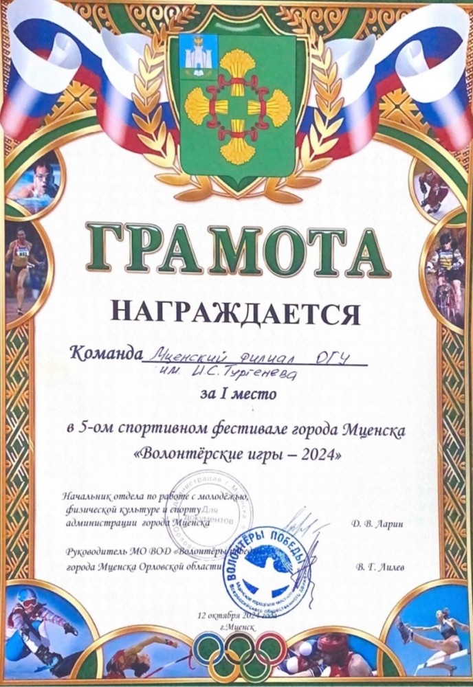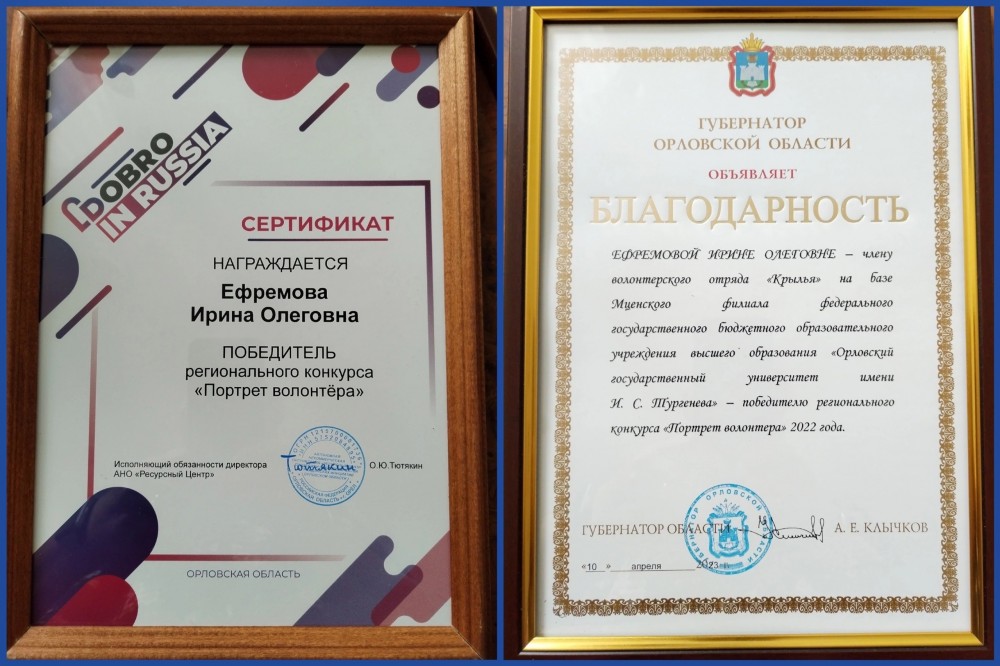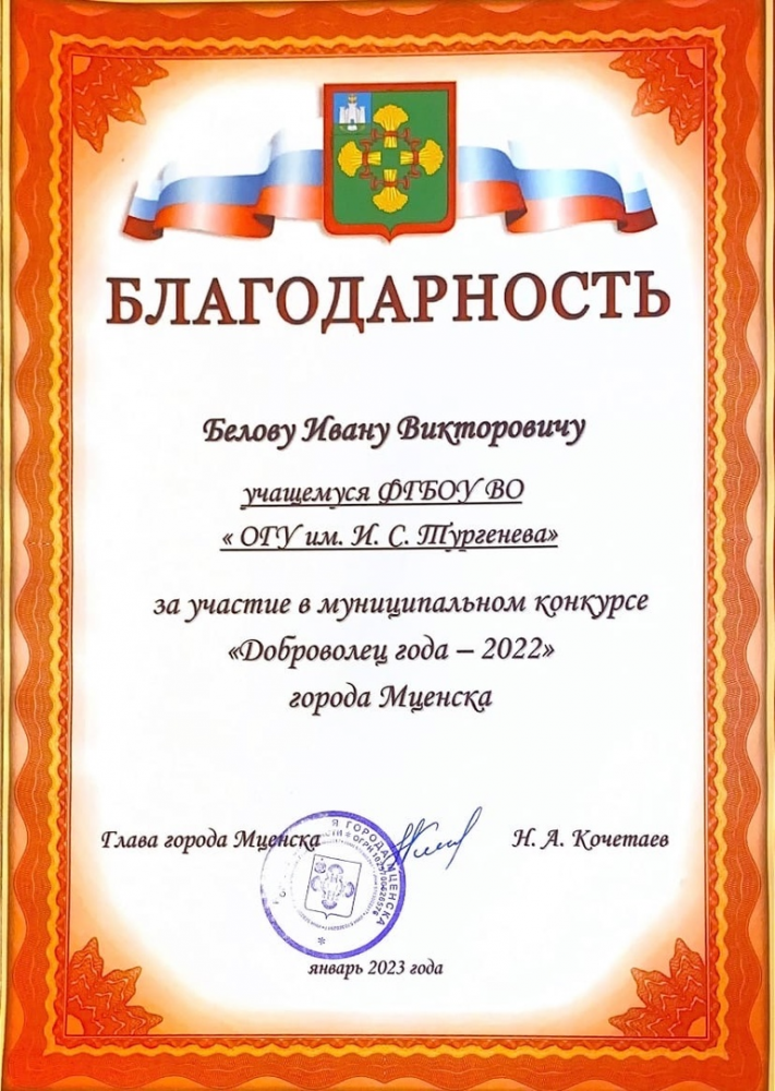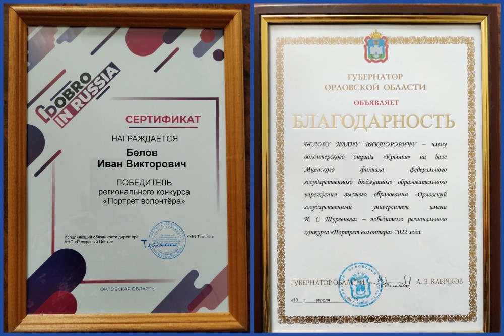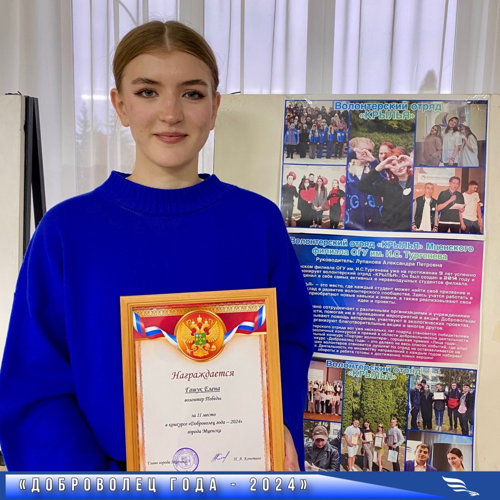 Конкурс «Доброволец года - 2025» проходил с 24 октября по 26 ноября 2025 года с целью стимулировать развитие добровольчества среди молодежи и всех жителей города Мценска. Участниками стали активные и неравнодушные люди всех возрастов, от юных до старшего поколения. Обладателем почетного 2-го места стала студентка Мценского филиала ОГУ имени И.С. Тургенева, член волонтерского отряда «КРЫЛЬЯ» Юлия Чернышова.