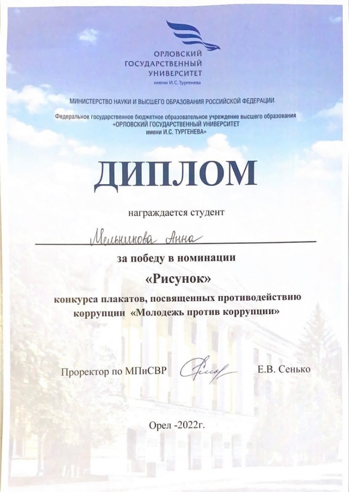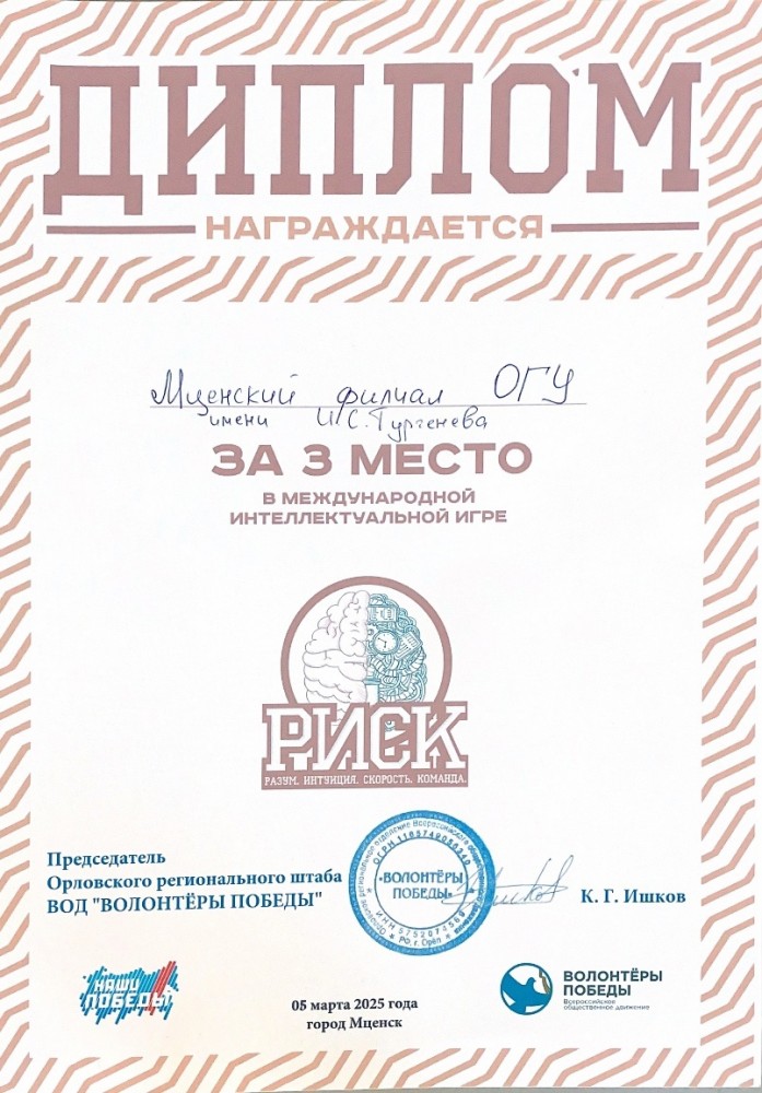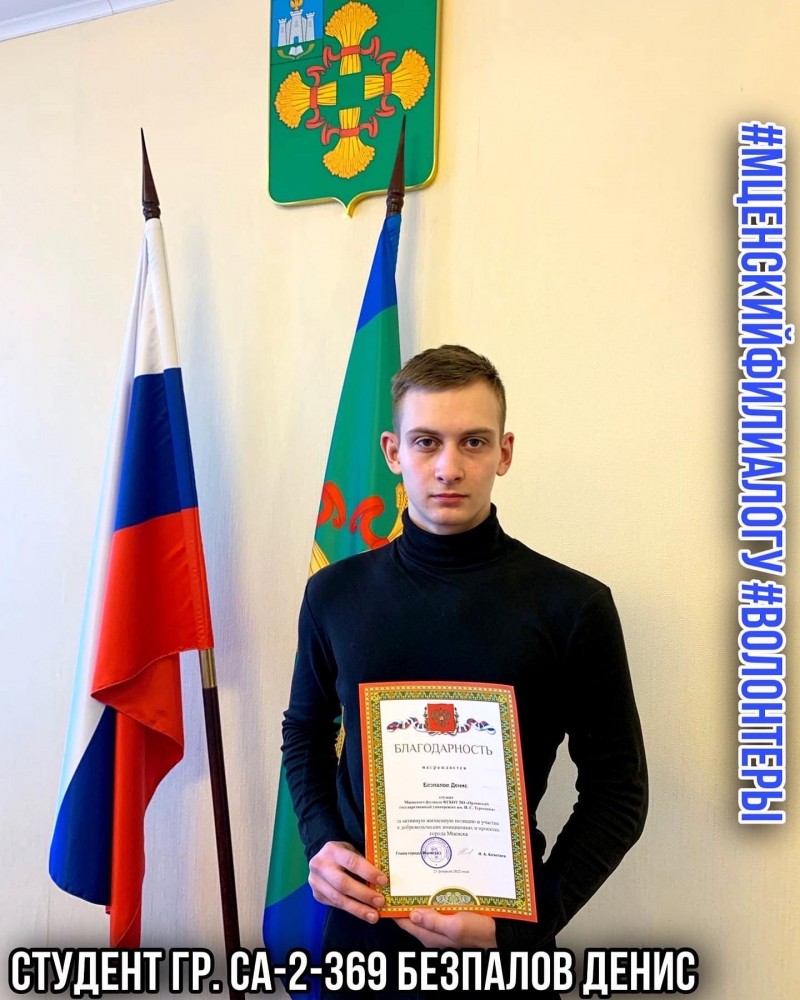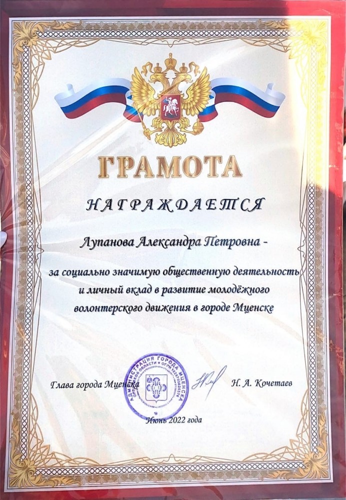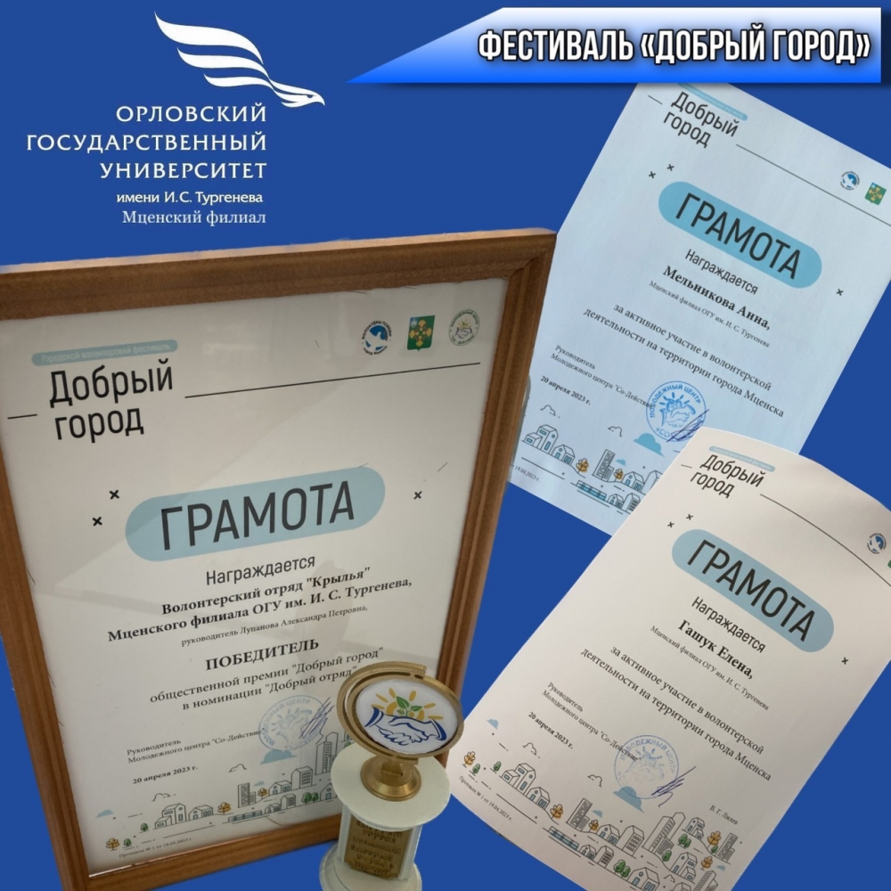 Конкурс «Доброволец года - 2025» проходил с 24 октября по 26 ноября 2025 года с целью стимулировать развитие добровольчества среди молодежи и всех жителей города Мценска. Участниками стали активные и неравнодушные люди всех возрастов, от юных до старшего поколения. Обладателем почетного 2-го места стала студентка Мценского филиала ОГУ имени И.С. Тургенева, член волонтерского отряда «КРЫЛЬЯ» Юлия Чернышова.