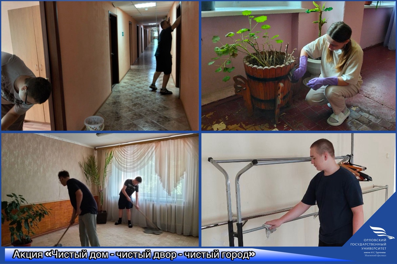 В преддверии Нового года в общежитии Мценского филиала ОГУ имени И. С. Тургенева продолжается акция «Чистота — залог здоровья». Студенты осуществляют уборку общих зон: моют полы, протирают поверхности, приводят в порядок холлы и лестничные пролёты.