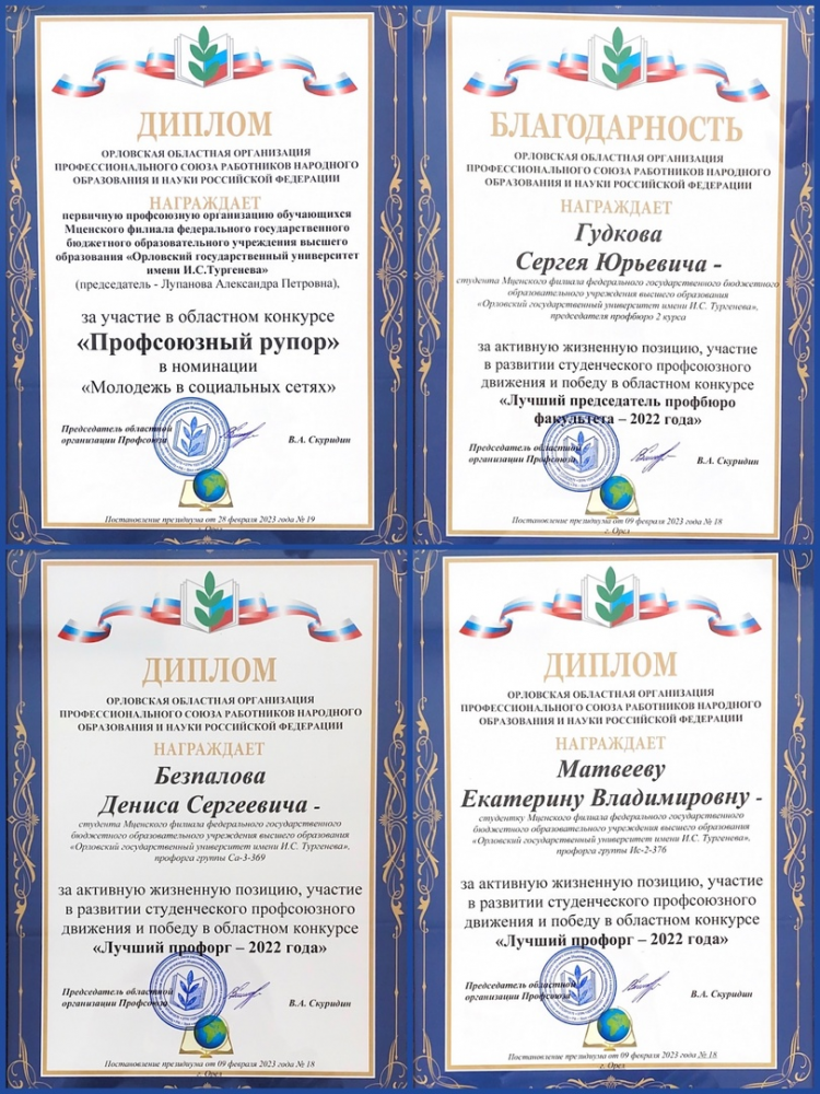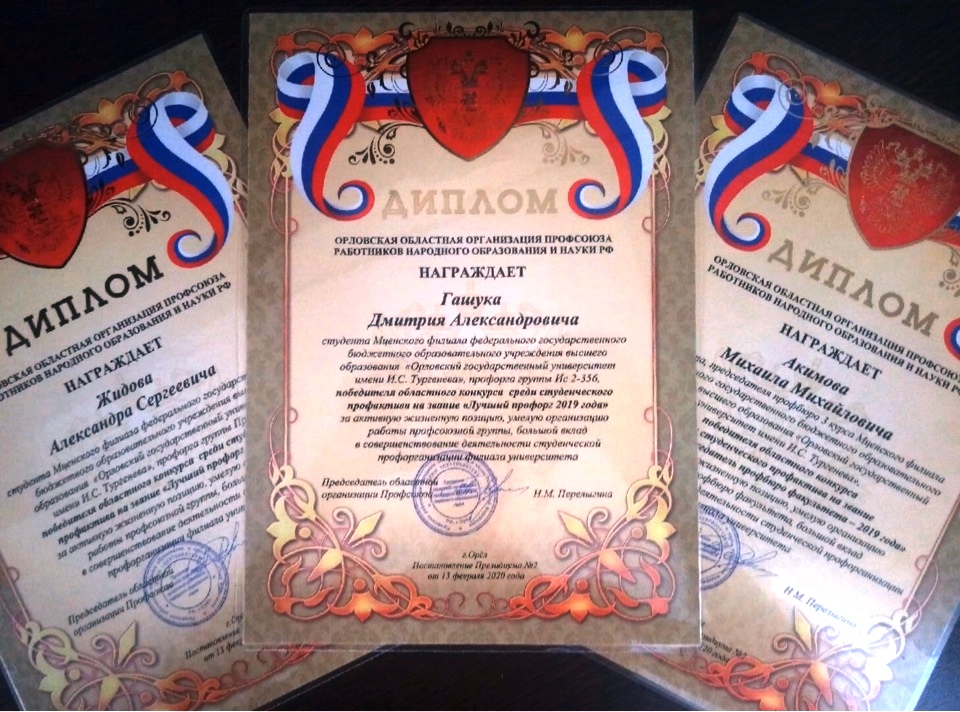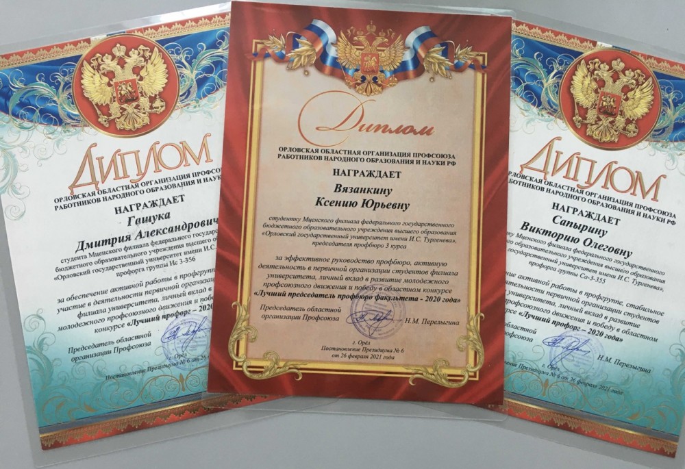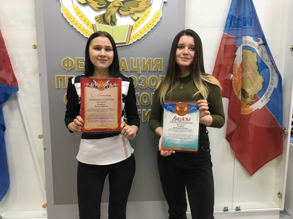 28 марта 2019 года в Орловской областной организации профсоюзов народного образования и науки РФ прошел ежегодный фестиваль «Летопись профсоюзных дел», посвященный 100-летию Орловских профсоюзов. В рамках мероприятия были награждены победители конкурсов «Лучший профорг» и Лучший председатель профбюро» 2018 года. Мы поздравляем наших победителей - Вязанкину Ксению и Гринева Алексея с победой! Успехов вам, новых достижений и личностного роста!