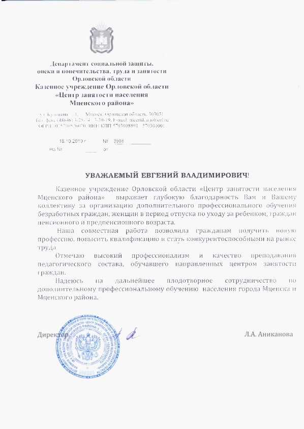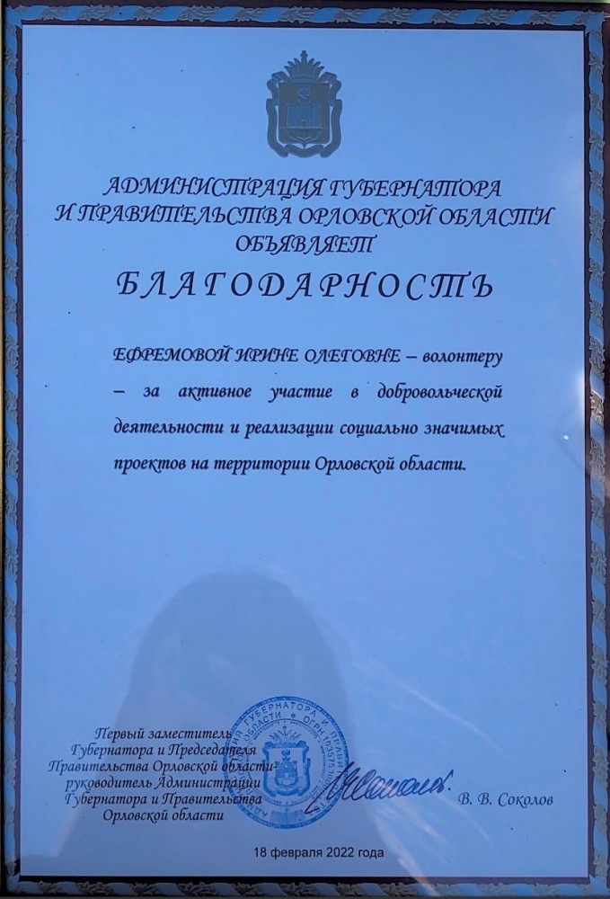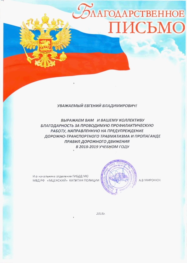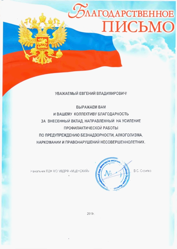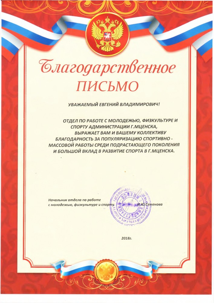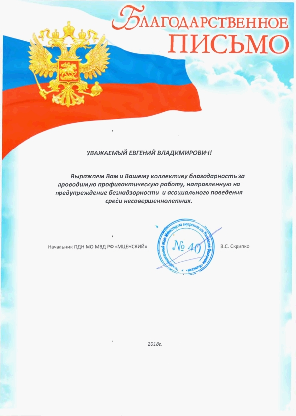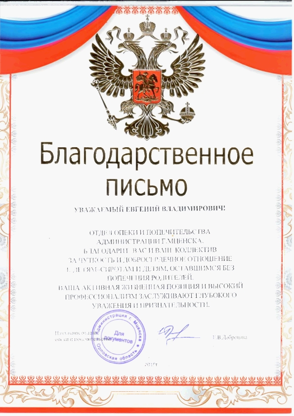 Благодарственное письмо от отдела опеки и попечительства администрации г.Мценска