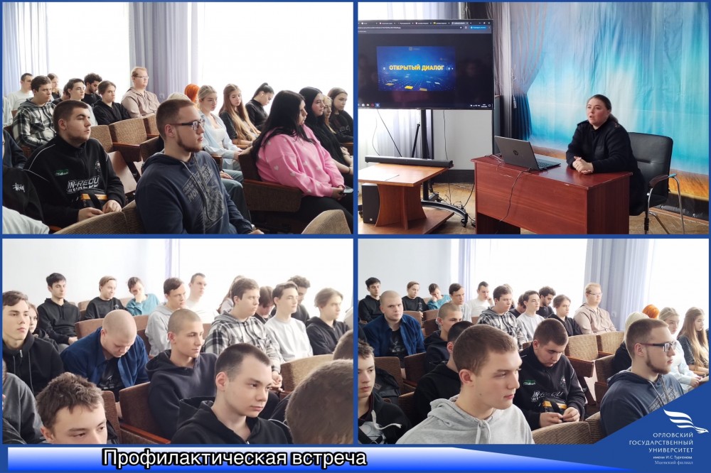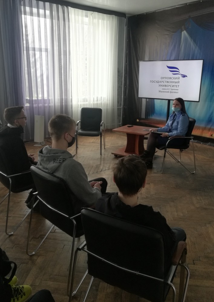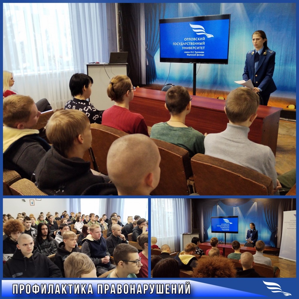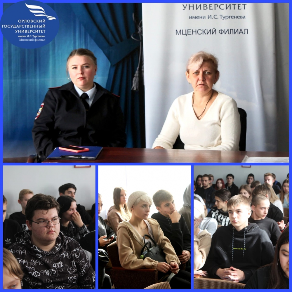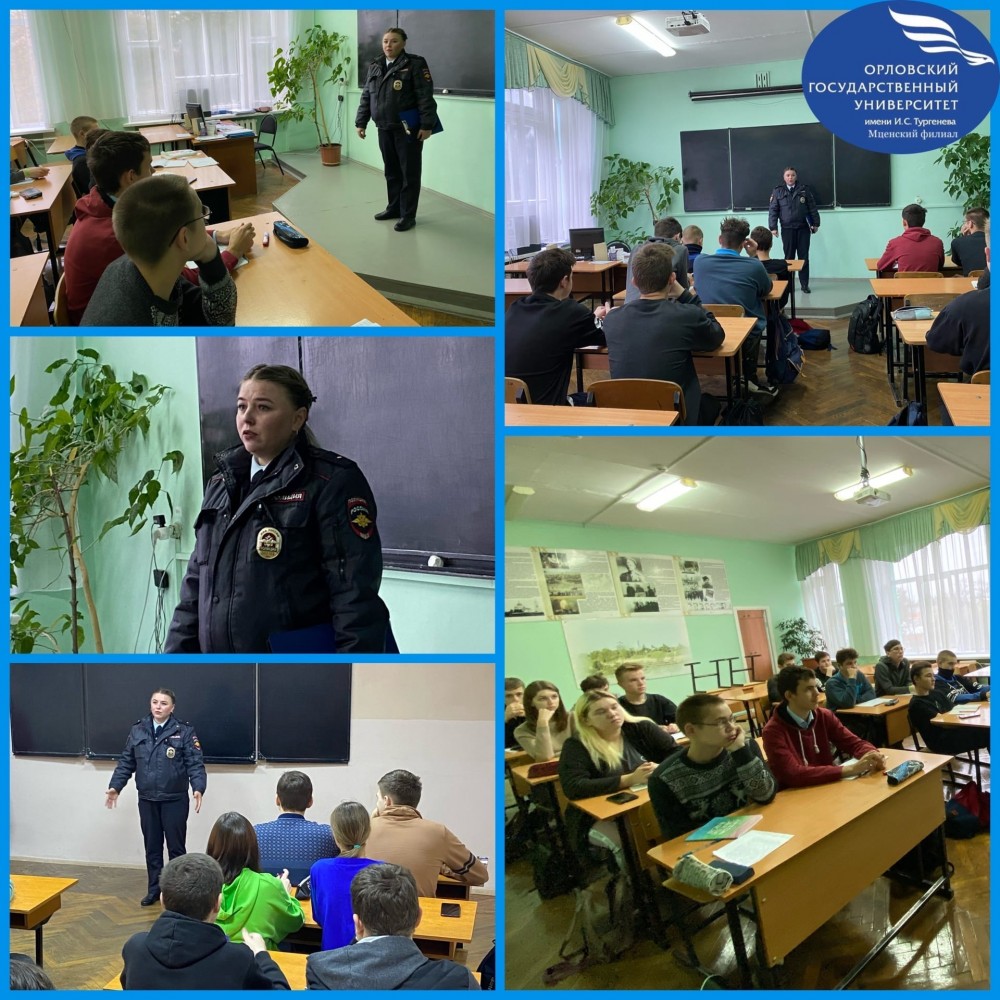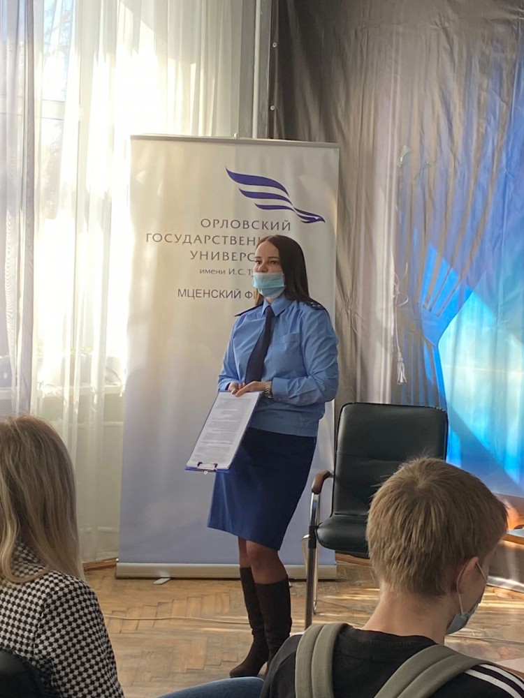 22 января прошла профилактическая встреча обучающихся Мценского филиала ОГУ имени И. С. Тургенева со старшим инспектором ПДН МО МВД России «Мценский», капитаном полиции Елецкой С. А. и сотрудником Центра по противодействию экстремизму УМВД России по Орловской области.