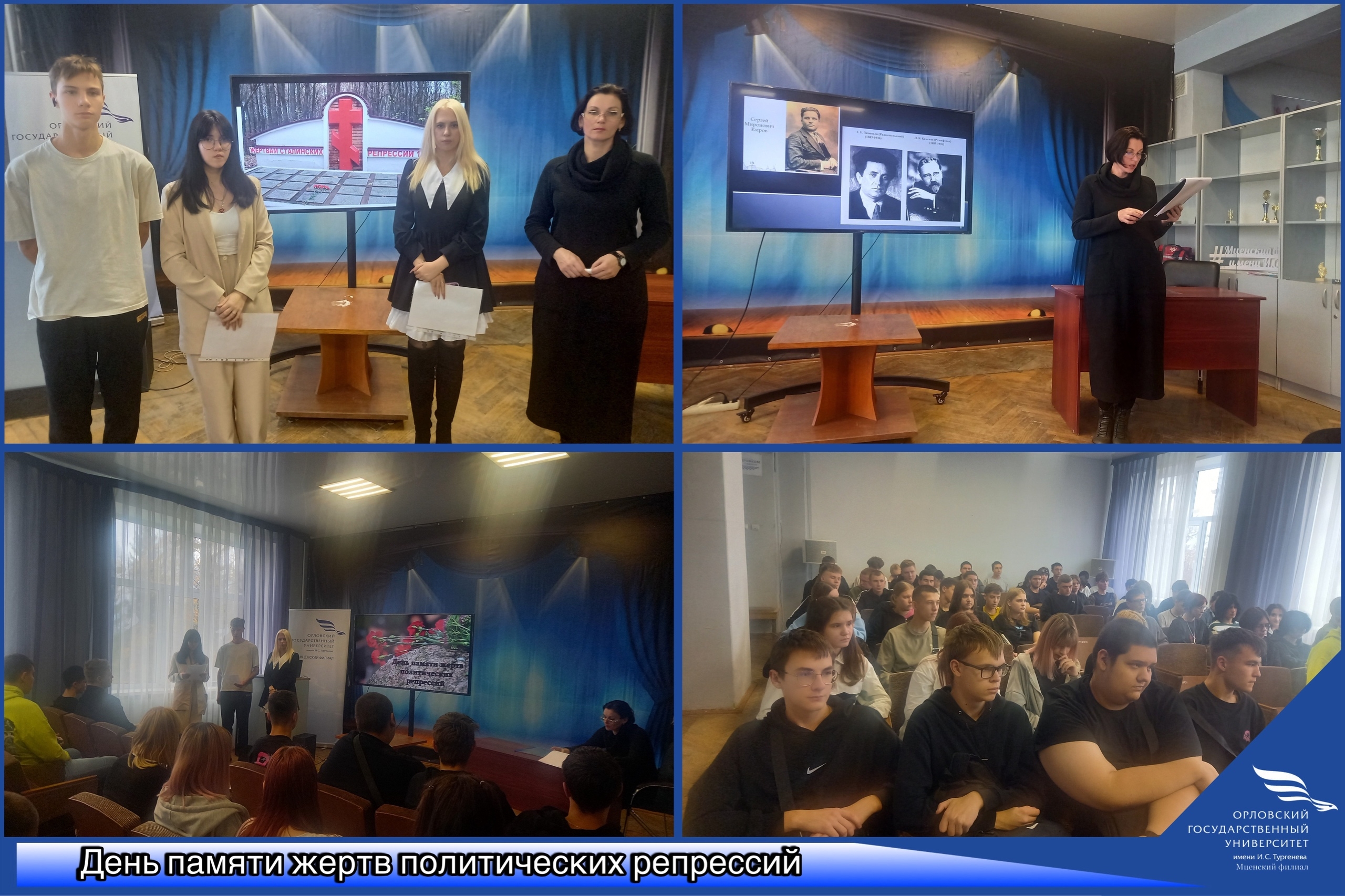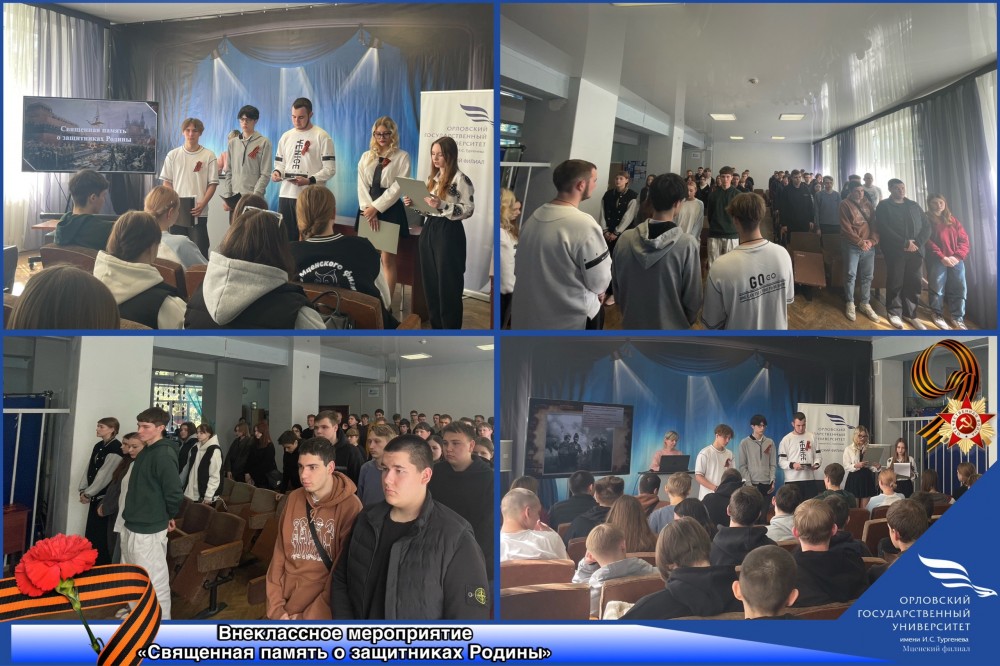17 октября студенты Мценского филиала ОГУ имени И.С.Тургенева приняли участие в перезахоронении останков бойца Красной Армии, найденных летом 2018 года. На траурной церемонии присутствовали Губернатор Орловской области Клычков А.Е., администрация и жители города. Церемония перезахоронения прошла в торжественной обстановке под звуки государственного гимна и залпы оружейного салюта.