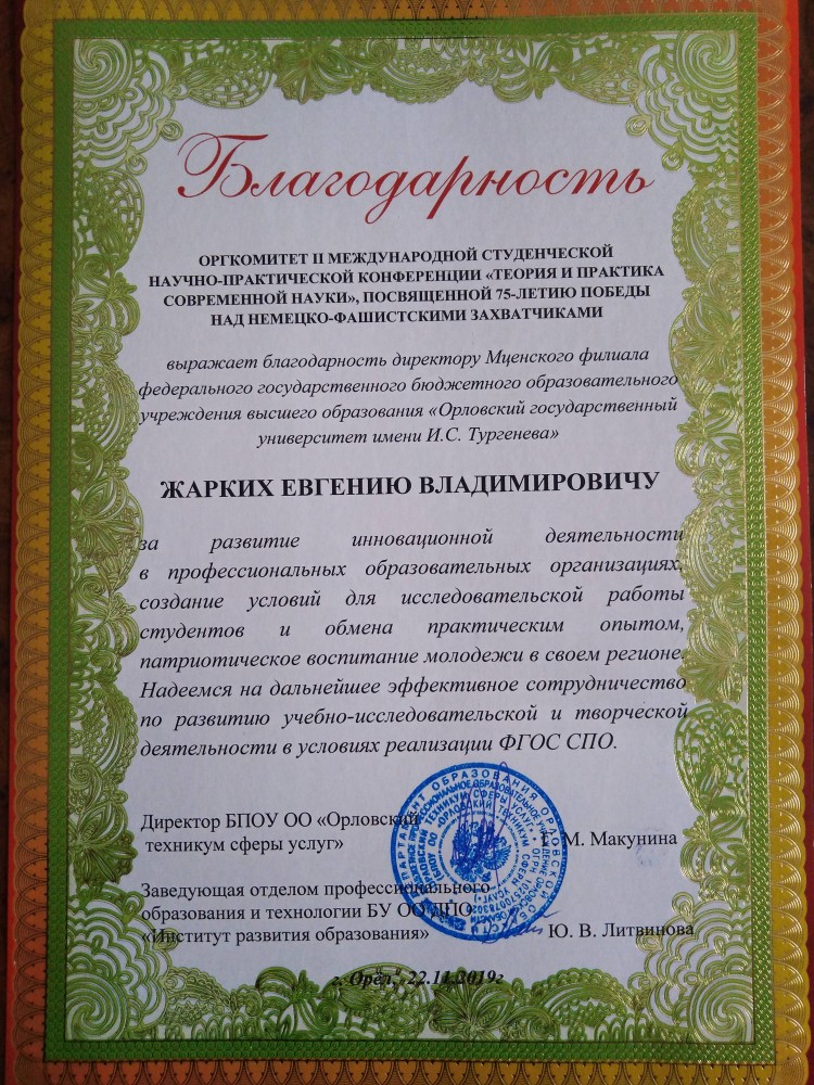С напутственным словом к выпускникам обратился директор филиала Жарких Евгений Владимирович, проректор по научно-технологической деятельности и аттестации научных кадров ОГУ имени И.С.Тургенева Радченко Сергей Юрьевич.