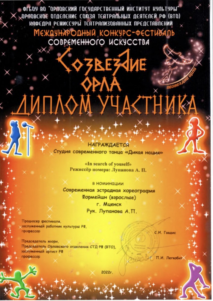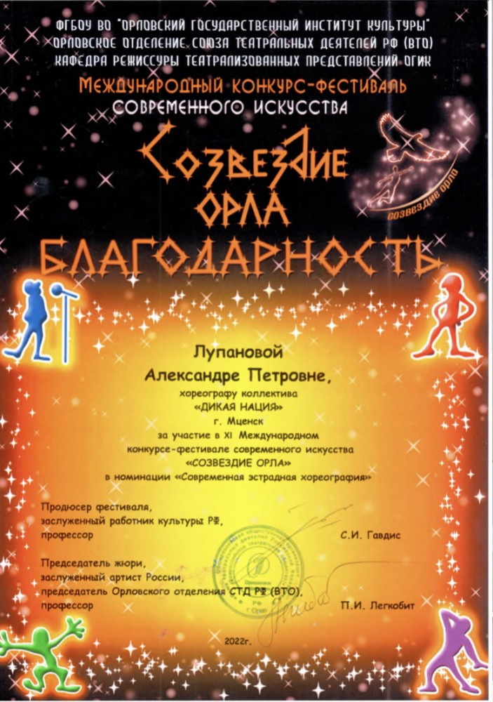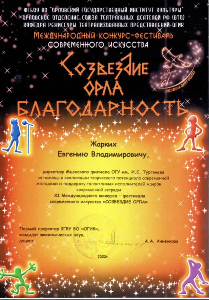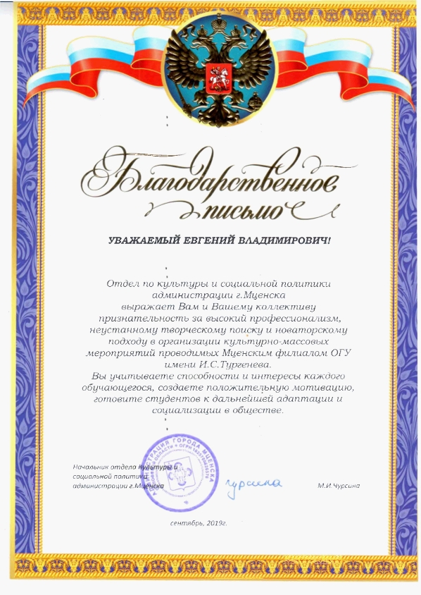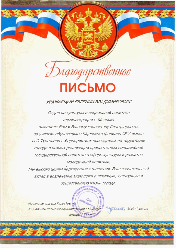 Благодарственное письмо от отдела по культуре и социальной политики администрации г.Мценска