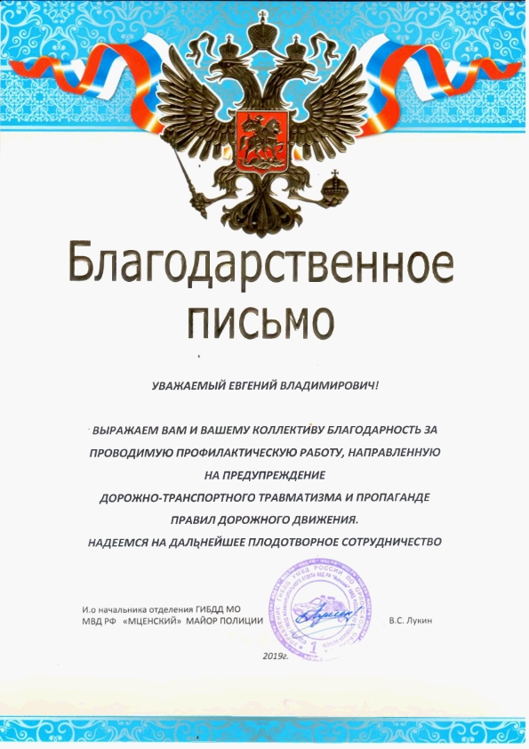 Благодарственное письмо от отдела опеки и попечительства администрации г.Мцеска