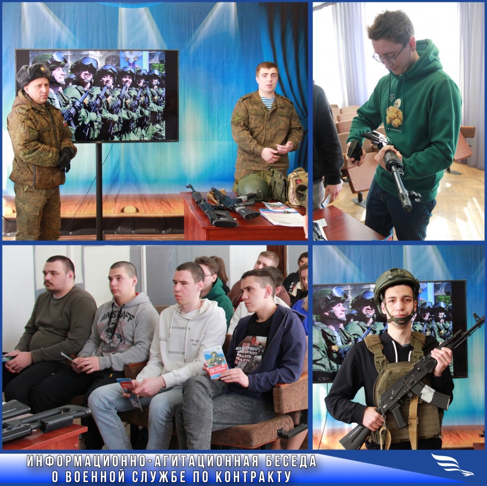 Обучающимся рассказали о преимуществах и перспективах при поступлении на военную службу по контракту, мерах социальной поддержки военнослужащих. Встречу провел инструктор пункта отбора на военную службу по контракту в г.Мценске Юлдашев А. В.