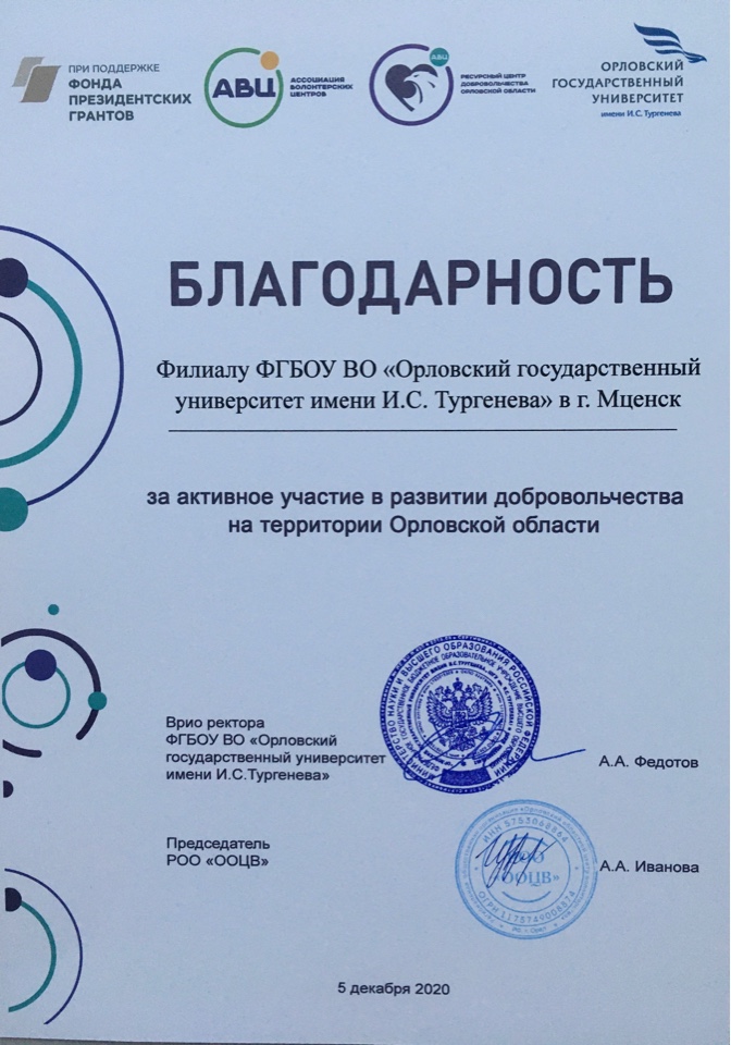 25 февраля 2019 года на базе Гимназии ОГУ имени И.С.Тургенева в г. Мценске прошел семинар «Добровольчество – вектор социального развития». На котором присутствовали волонтерские объединения г. Мценска и Мценского района.