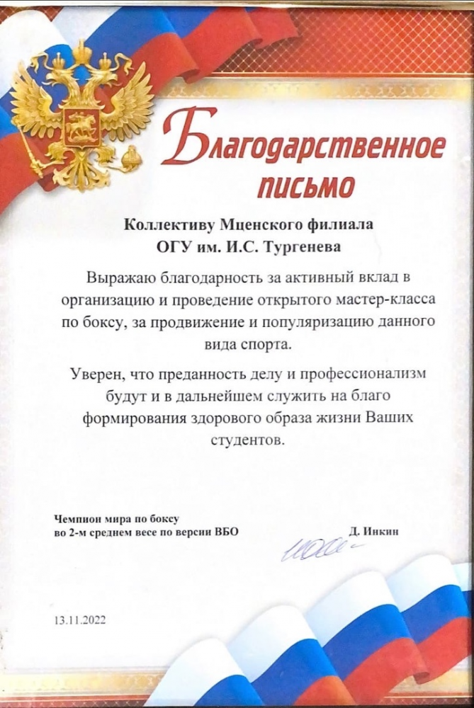 7-8 сентября 2018 года на базе спортивного зала Мценского филиала (ул.Тургенева, 85) состоялся мастер-класс по боксу, который провели Владимир Зиневич (вице-чемпион Европы, чемпион СССР среди профессионалов, бронзовый призер Чемпионата СССР, мастер спорта СССР международного класса по кикбоксингу) и руководитель секции Тиганов Кирилл. В.Зиневич рассказал начинающим спортсменам о самой памятной и трудной для него победе, тренерах, причинах завершения карьеры, давал советы и наставления, отвечал на вопросы, делился своей методикой и опытом работы. После того, как были получены ответы на все заданные вопросы, мастер провел трехчасовую тренировку. Завершилась встреча традиционным снимком на память и автограф-сессией.