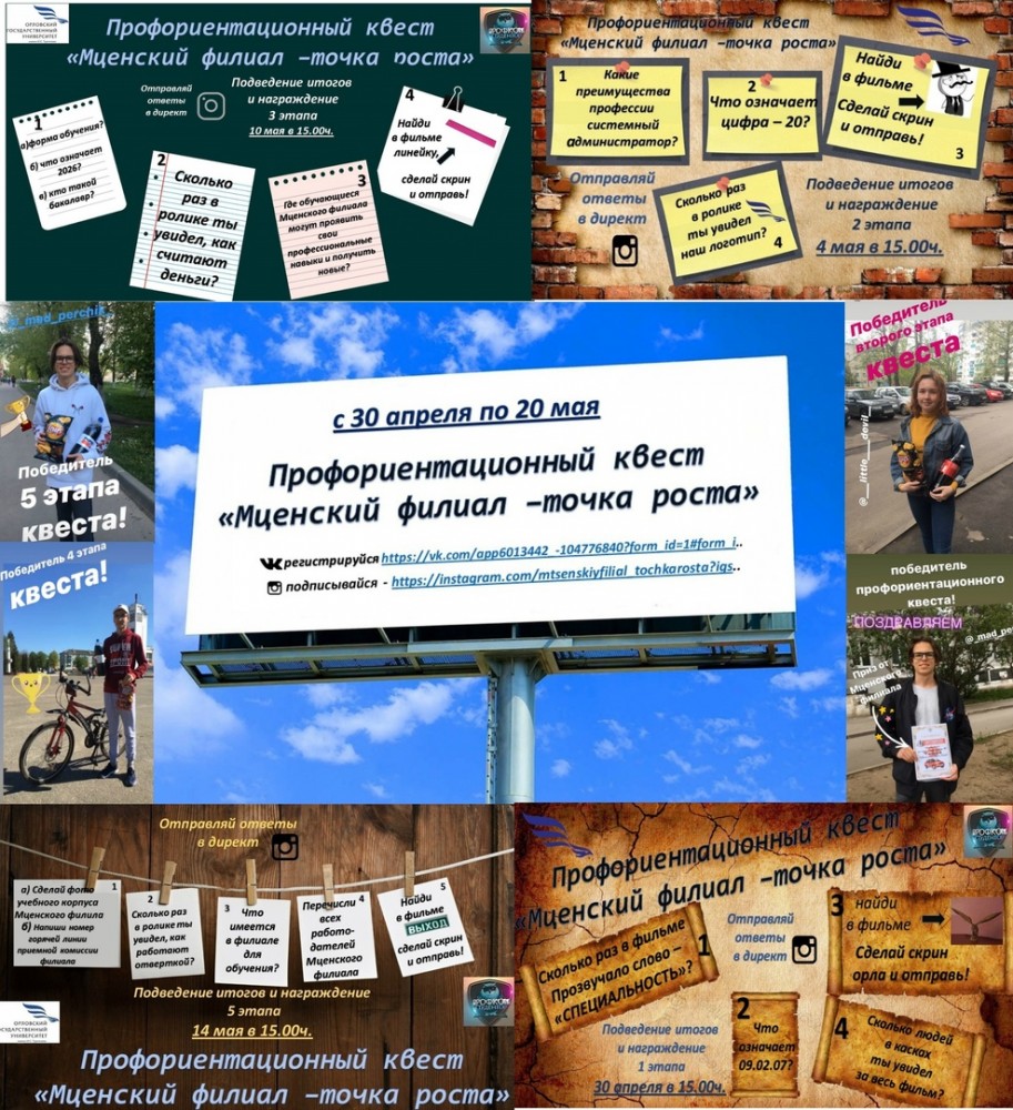 В новом формате 18 апреля 2019 года в Мценском филиале ОГУ имени И.С.Тургенева прошел форум студенческой молодежи «Мценский филиал-точка роста». Более 200 будущих выпускников школ в форме квеста познакомились со студенческой жизнью. Выполняя задания, зарабатывая тем самым студенческую валюту – Studcoin, они, по завершению квеста, могли приобрести напитки и сладкие круассаны.