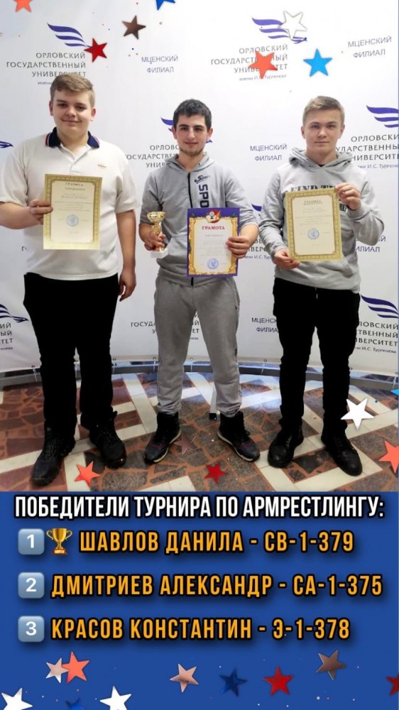 21 февраля 2019 года в спортивном зале Мценского филиала ОГУ имени И.С. Тургенева состоялся турнир по армрестлингу, посвященный Дню Защитника Отечества. Армрестлинг – одно из самых честных единоборств. Борьба на руках позволяет испытать силы любому человеку, независимо от его опыта, навыков и физических данных. У обучающихся представилась возможность, в канун мужского праздника, проверить себя и побороться, проявив всю свою силу в борьбе, за победные места.