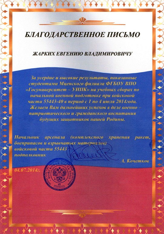 Впервые учебные сборы по начальной военной подготовке в рамках дисциплины ОБЖ были проведены со студентами среднего профессионального образования Мценского филиала «Госуниверситета – УНПК». Проект был «пилотным» для нашего учебного заведения, поэтому студенты - участники для него отбирались особенно тщательно. Кандидатов осталось в итоге 14 человек. Из них был образован учебный взвод. Сразу по приезду в воинскую часть студенты были переодеты в военную форму одежды. За время учебных сборов студенты закрепили полученные теоретические знания начальной военной подготовки по дисциплине ОБЖ в войсковых условиях: овладели основными строевыми приемами; научились правильному отношению к приказам командиров и начальников, воинской исполнительности; каждый сдал зачет с оценкой по физической подготовке; по огневой подготовке изучили материальную часть ручного пулемета РПК, автомата АК-74, пистолета ПМ; при проведении учебных – боевых стрельб получили персональную оценку по стрельбе из автомата и пистолета; получили знания и навыки по радиационной, химической и биологической защите (РХБЗ). |
