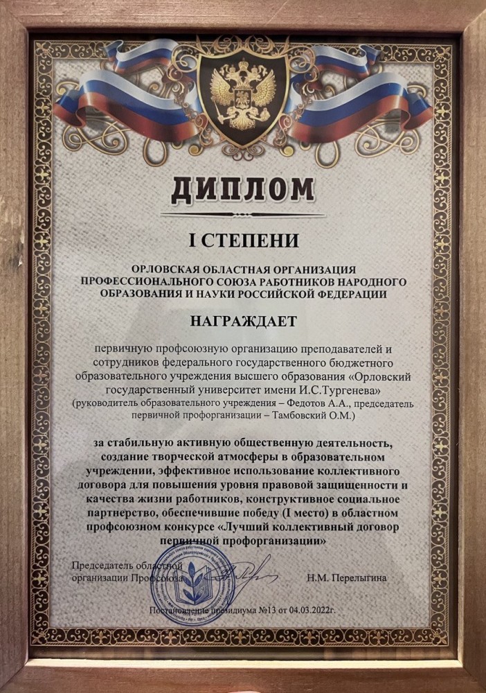 30 октября на заседание Ученого совета Орловского государственного университета имени И.С. Тургенева и.о.ректора Павел Александрович Меркулов вручил Почетную грамоту Центрального совета Профессионального союза работников народного образования и науки РФ Горину Андрею Владимировичу, председателю профсоюзной организации политехнического института имени Н.Н. Поликарпова, кандидату технических наук, доценту кафедры мехатроники, механики и робототехники, за многолетнюю, плодотворную деятельность по защите социально-трудовых прав и профессиональных интересов членов профсоюза, высокий профессионализм и ответственность, активную жизненную позицию.