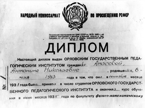 1935. Диплом №1 выпускницы физмата А.Н. Аносовой |