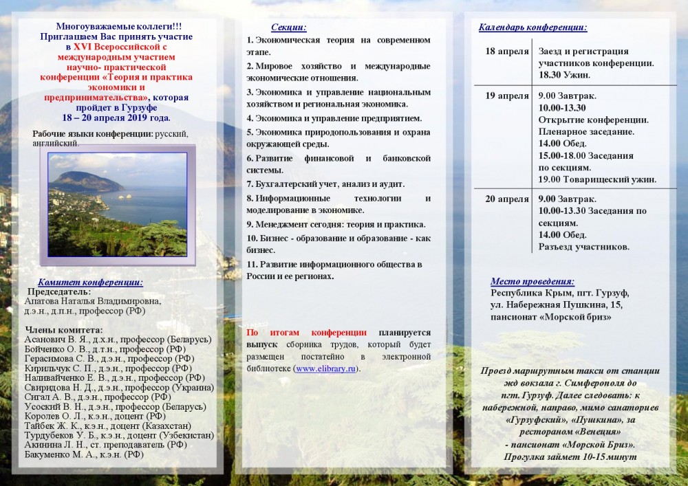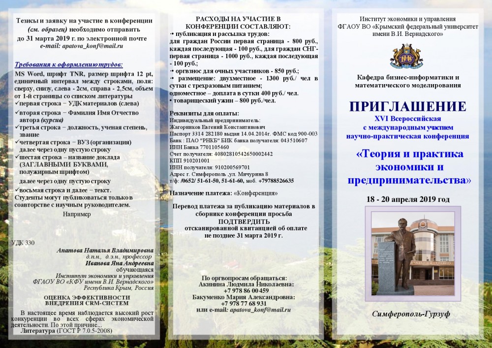 Материалы принимаются до 31 марта 2019 г. по электронной почте e-mail: apatova_konf@mail.ru