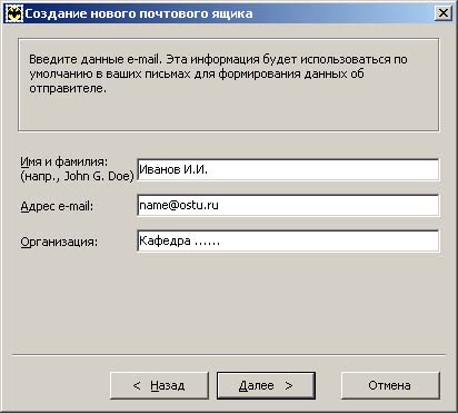 Поля "Имя и Фамилия" и "Организация" заполните по собственному усмотрению. Эти данные будут отображаться в поле "От кого" отправляемых Вами писем. Нажмите кнопку Next (Далее).