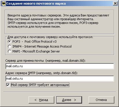 - Сервер исходящей почты (SMTP-сервер): mail.ostu.ru: